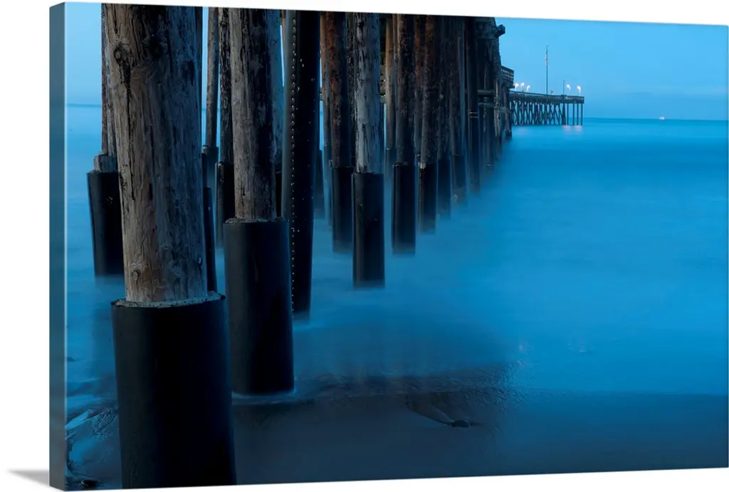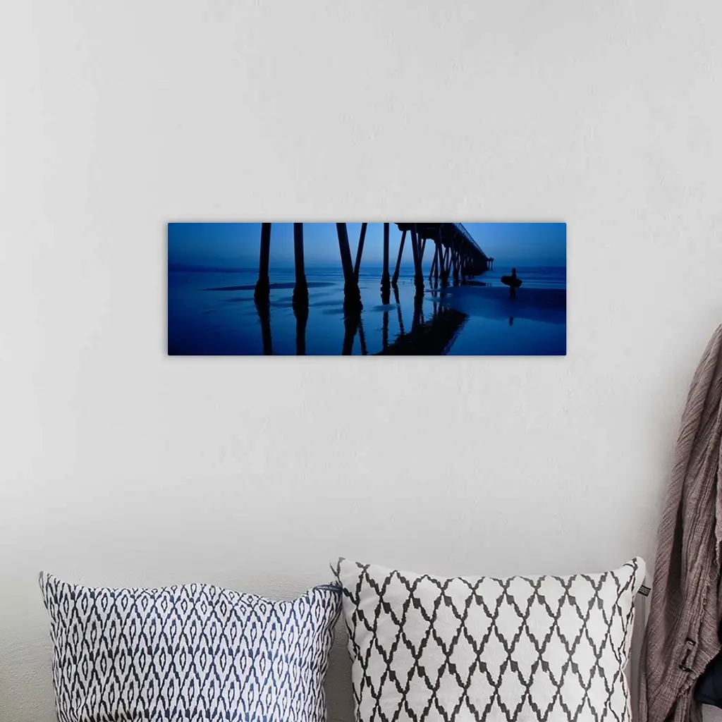 Big, landscape, panoramic photograph looking upward at an angle toward the Hermosa Beach Pier in California, at dusk. The silhouette of a surfer is next to the pier.