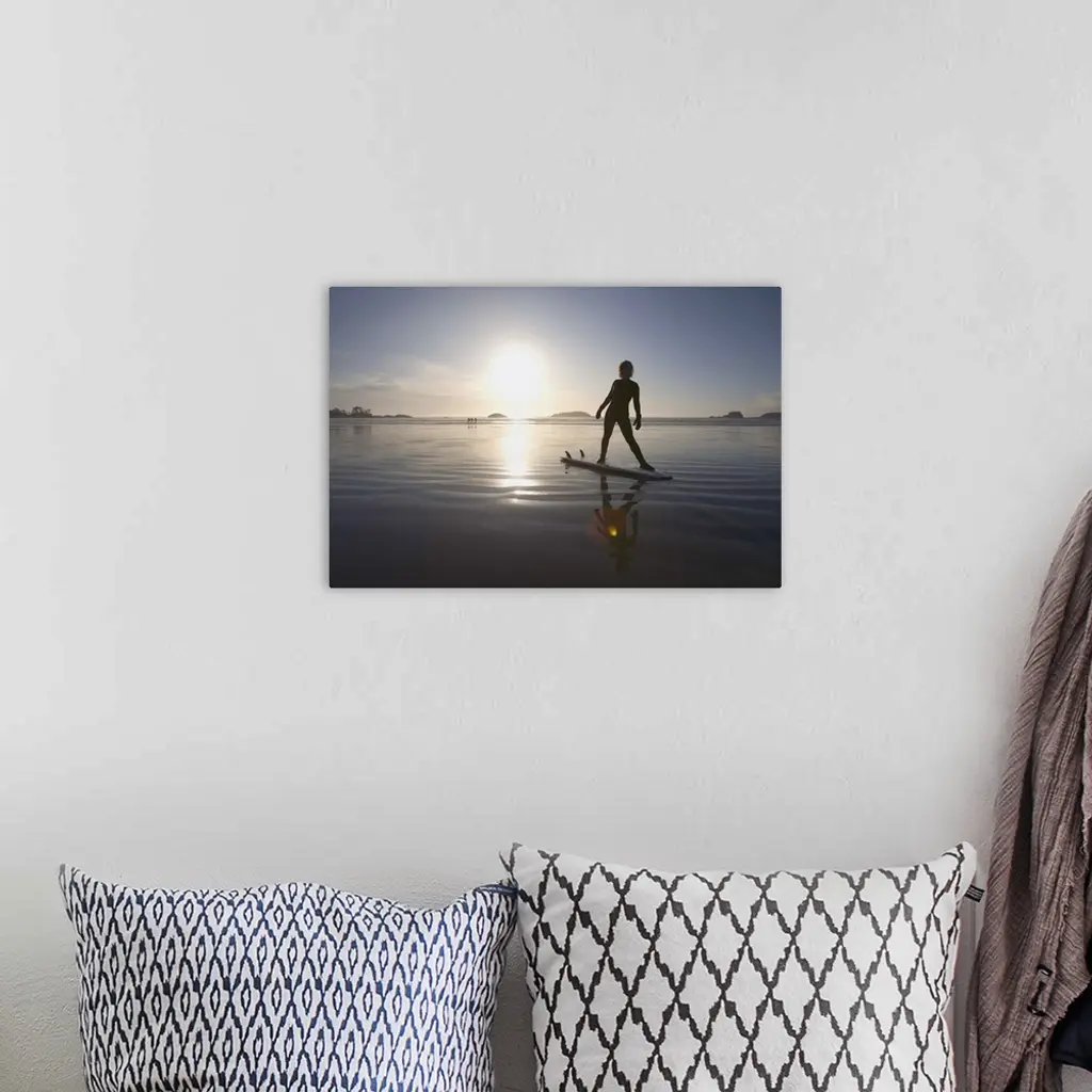 Silhouette Of Female Surfer Doing Yoga Stretches