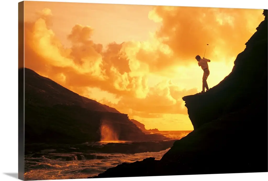 Silhouette Of Golfer Swinging Club On Golf Course At Sunset