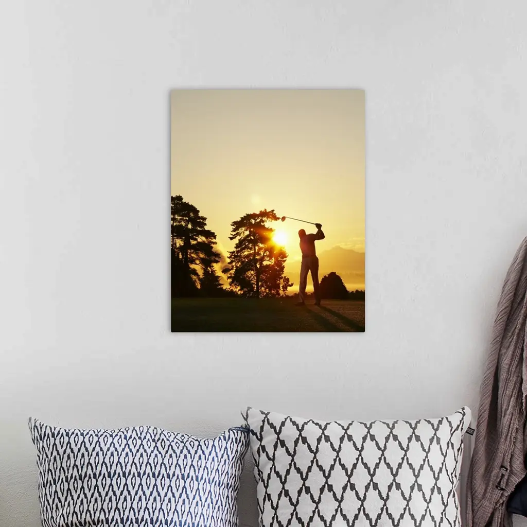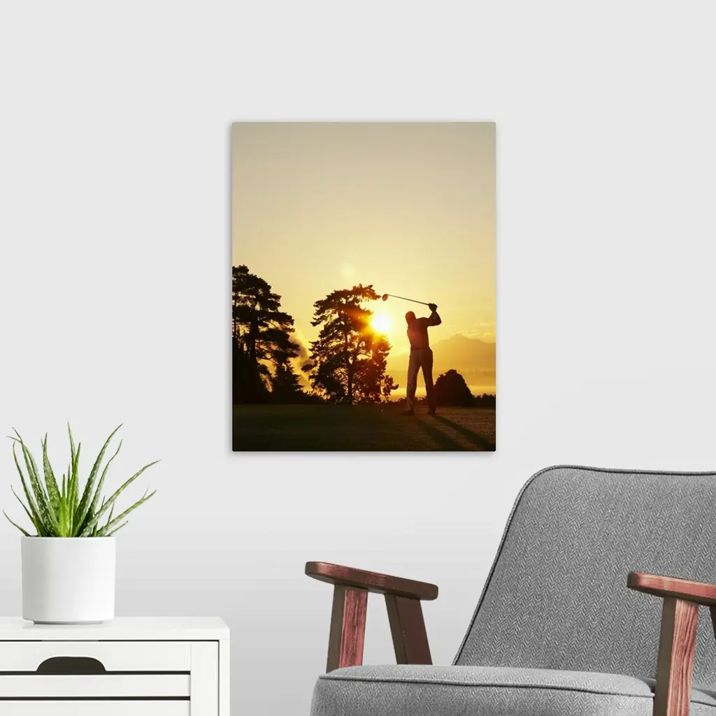 Big, vertical photograph of the setting sun behind trees on a golf course. The silhouette of a golfer swinging the club in the foreground.