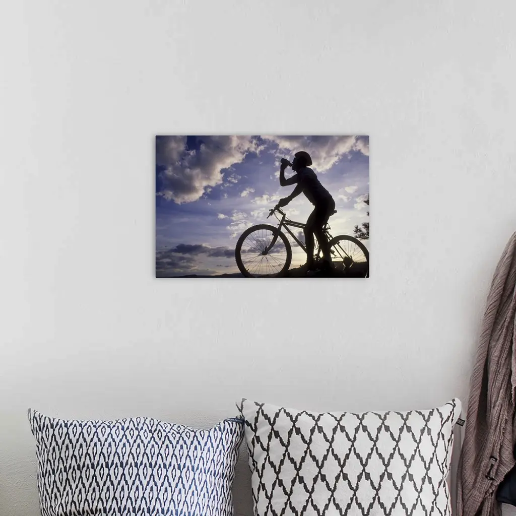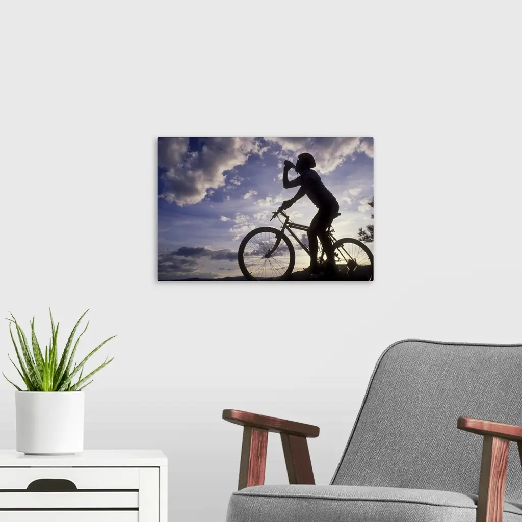 Silhouette Of Mountain Biker Drinking At The Summit During Sunset
