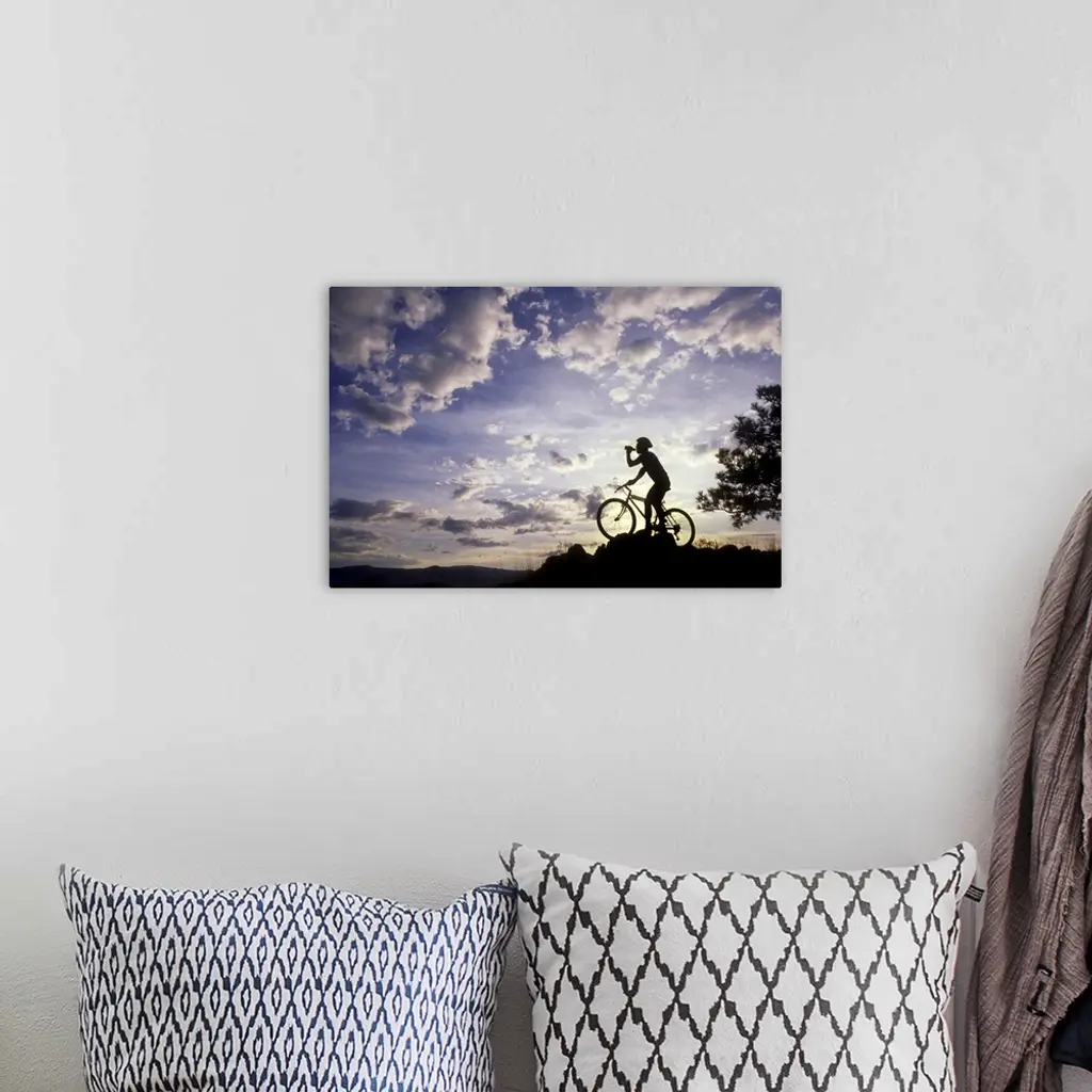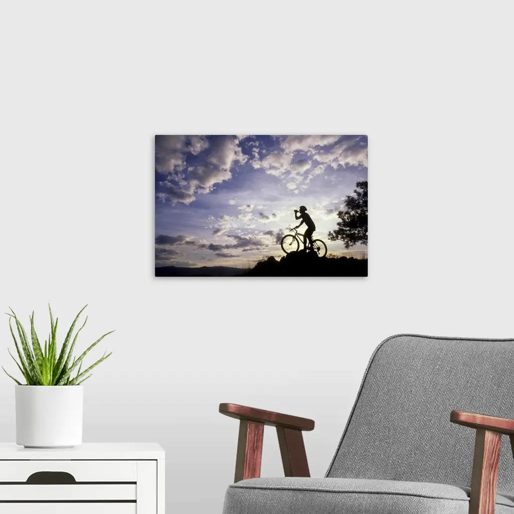 Silhouette Of Mountain Biker Drinking At The Summit During Sunset