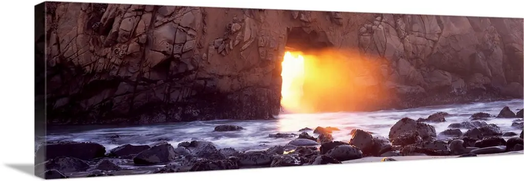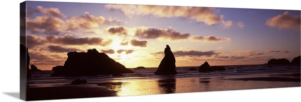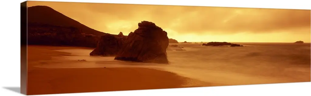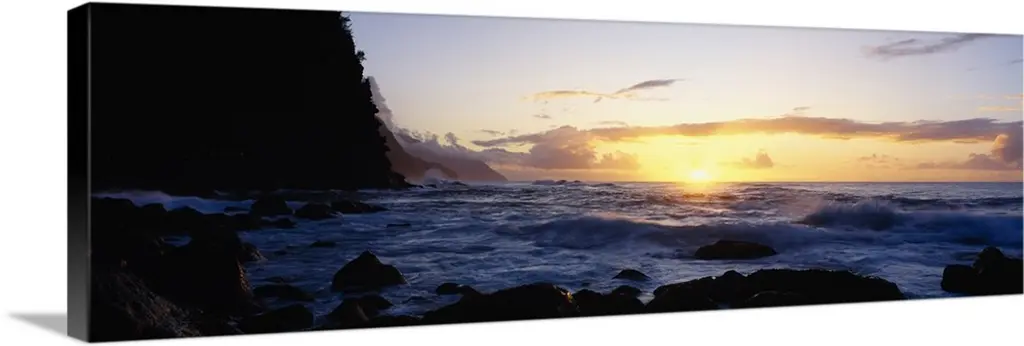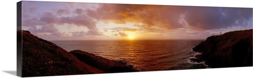 Panoramic photograph displays a sunburnt sky as the sun begins to set over the profile of a rocky shoreline in North America.