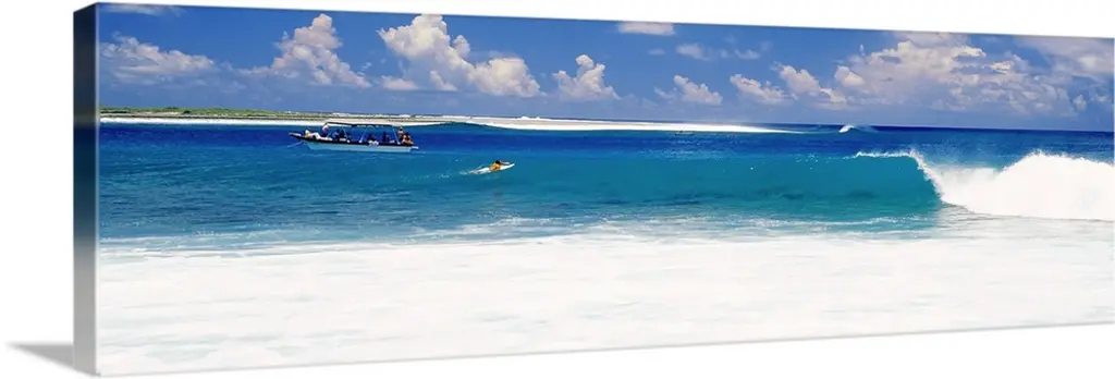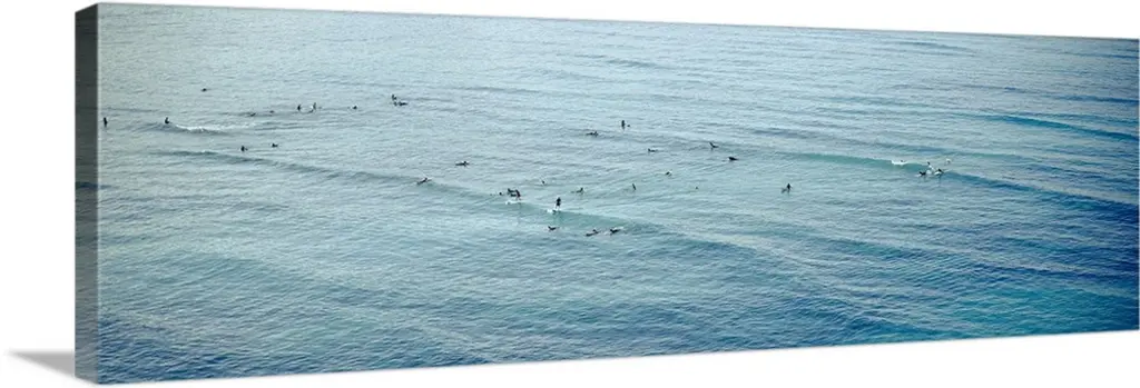 Panoramic photograph of beachgoers at water's edge with waves and ocean in the distance.