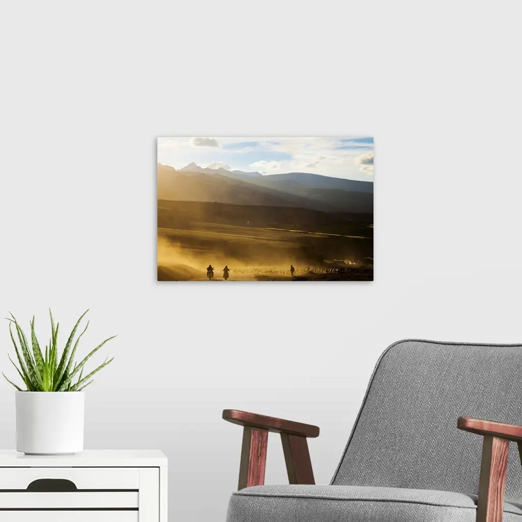 Riders and shepherd on road, Ladakh, India.
