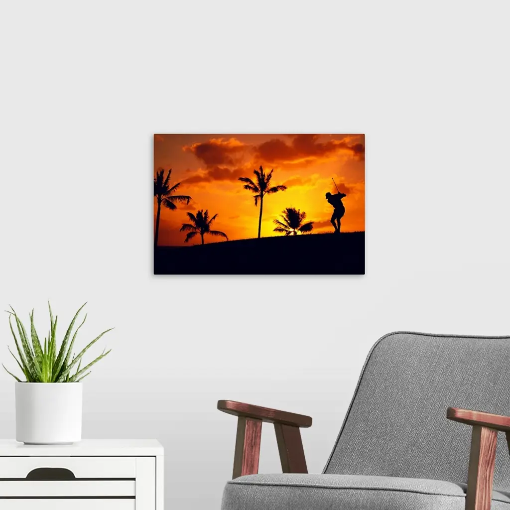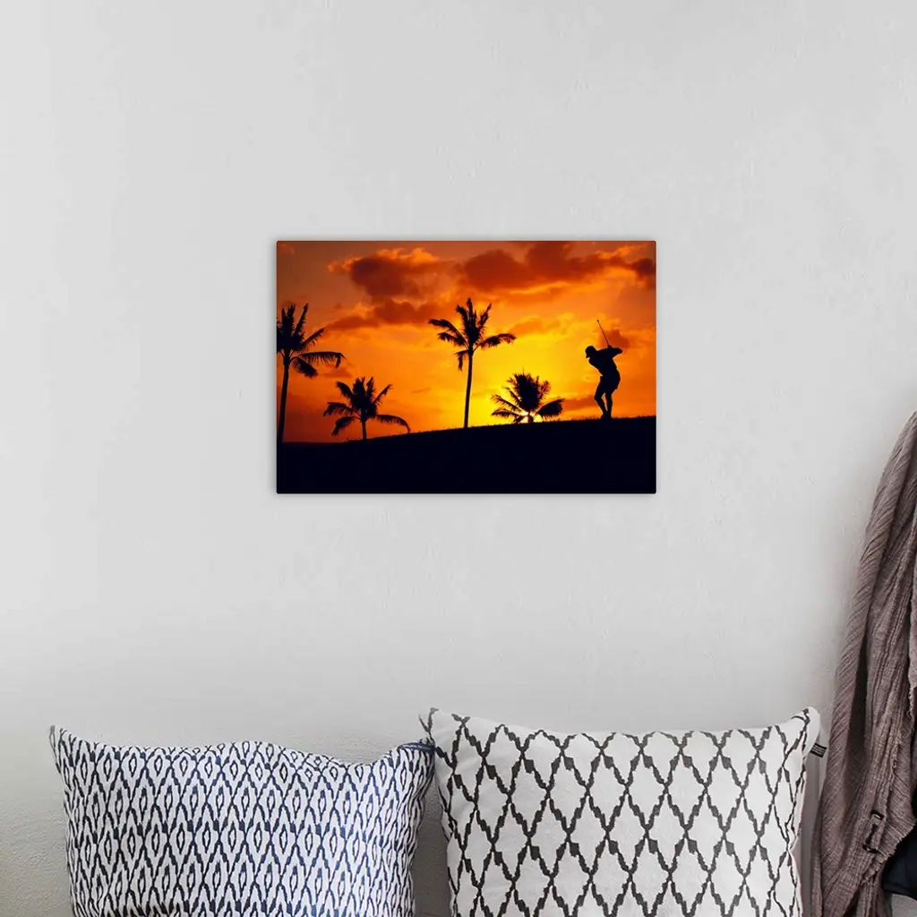Silhouetted Golfer In Dramatic Orange Sunset Sky wall art for home and office decor. Discover canvas art prints, photos, mural, big canvas art and framed wall art in GreatBigCanvas.com's varied collections.