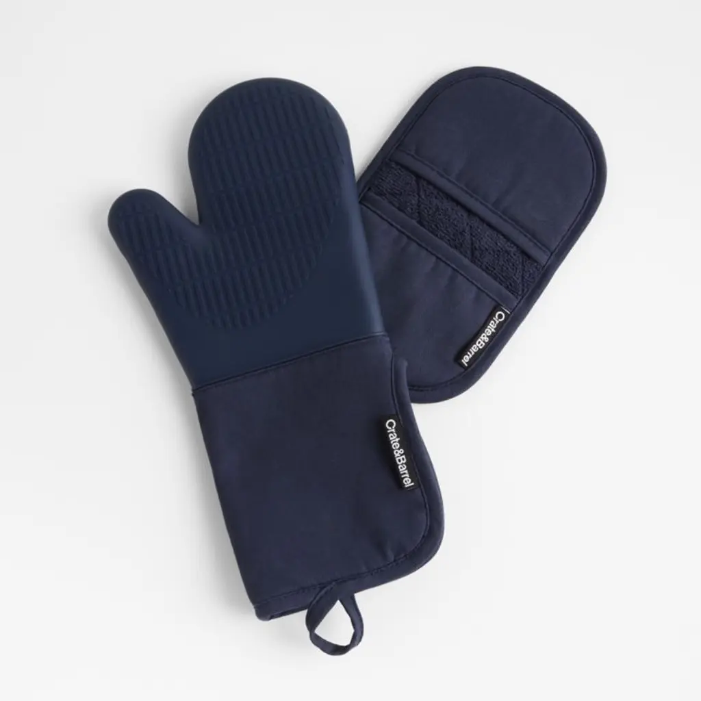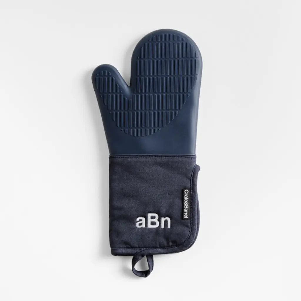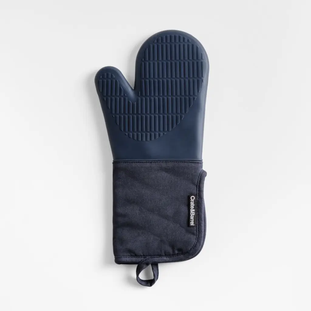 Keep your cool with our exclusive blue oven mitt with silicone grip. Lined with terry cloth, the organic cotton mitt protects your arm and hand as you cook or bake. The silicone grip provides a solid, heat-resistant hold on hot skillet handles, cast iron pans and just-from-the-oven baking dishes. When not in use, the silicone oven mitt hangs within easy reach thanks to a hanging loop and hidden magnet. For a cohesive look, pair with the matching pot holder and our other indigo kitchen textiles.