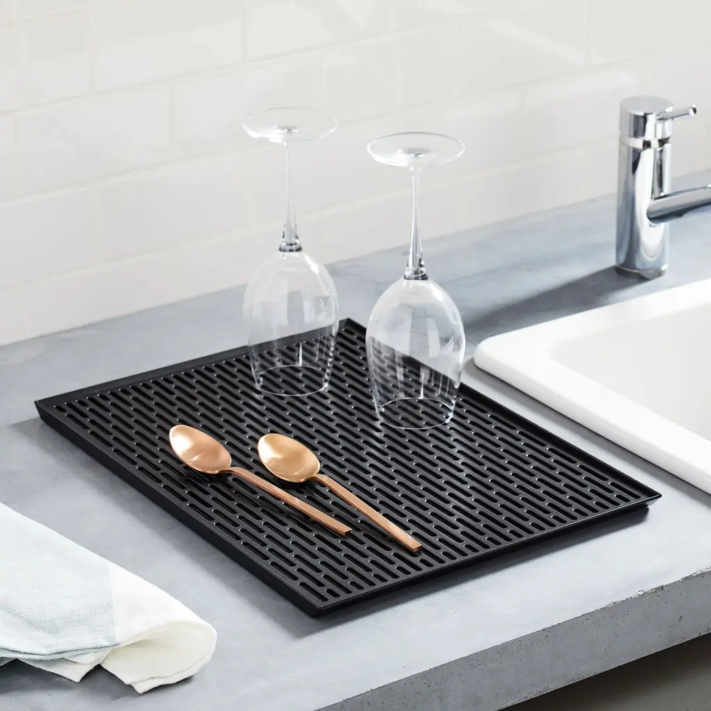 Large and delicate items dry efficiently on this special silicone dish drying mat. Ribbed detail lets air flow to promote drying. Heat resistant to 570 degrees, the mat can also be used as a trivet. Mat rolls up for compact storage.