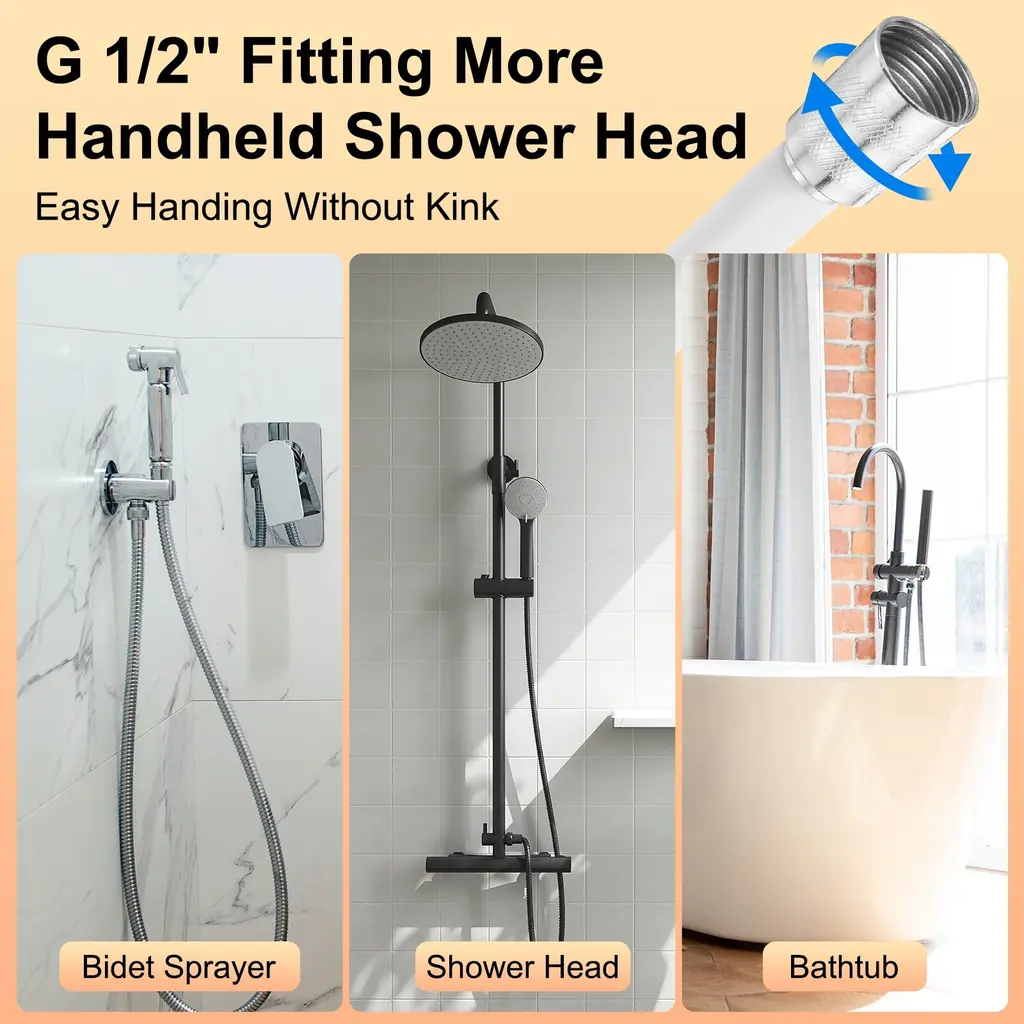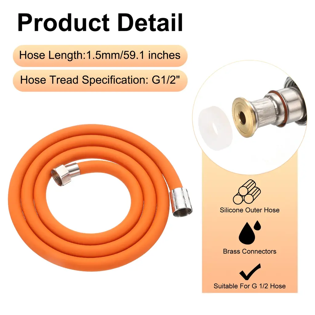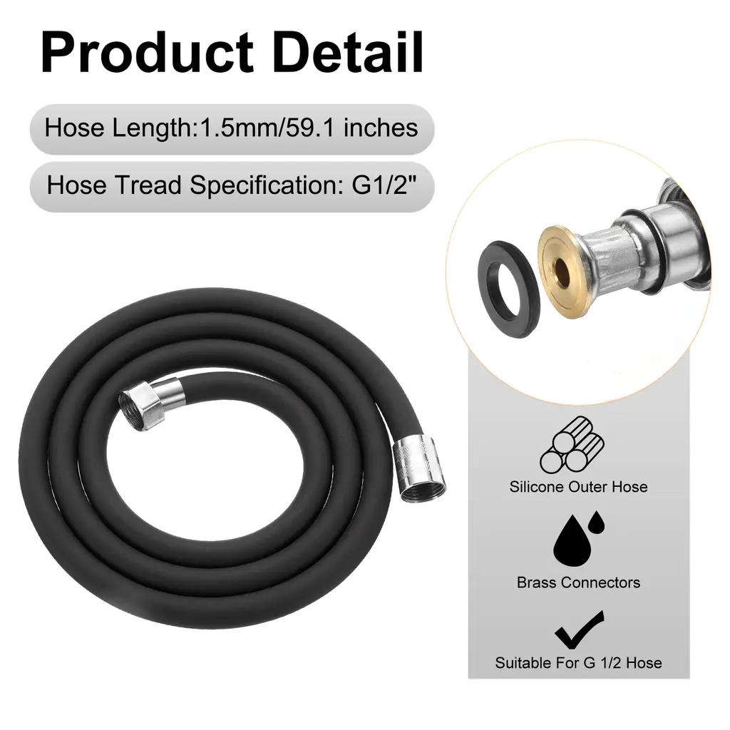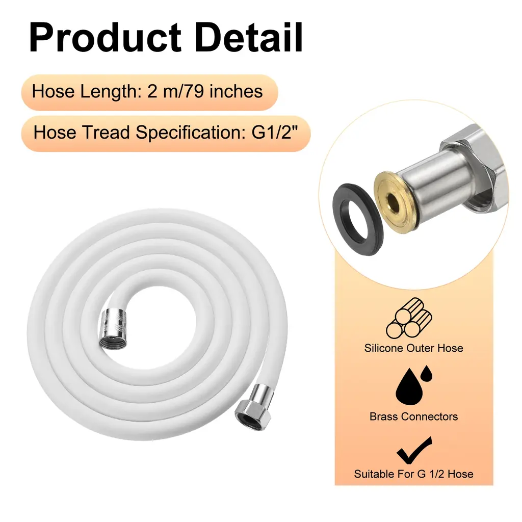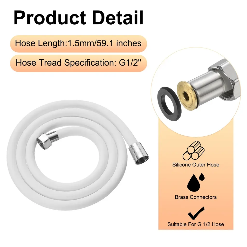 Description:Materials: The shower nozzle hose has three layers of material (Inner Layer Of Thickened Silicone, Middle Layer Of Thickened Pressure-Resistant Braided Layer, And Outer Layer Of Anti-Corrosion Isolation Adhesive), which is flexible, easy to handle, and resistant to wear and tear.Anti-Winding Designed: The brass fitting allows the shower head to be rotated freely for a full 360-degree rotation anti-winding design. You Can Easily Enjoy Every Shower.Double-Layer Protection: The shower hose features a thickened zinc-plating steel interface and a double-layer zinc-plating steel protective sleeve. The double-layer brass sleeve ensures a secure connection, preventing pipes from slipping off and enhancing durability for prolonged use.Wide Application: The shower hose replacement can be used to replace handheld shower heads and bidet sprayers. Fitting for bathtubs, showers, pet bathing, elderly and disabled care, bidet sprayers, shower wands, RVs and more.Specification:Size: 1.5 m/59 inchesInner Diameter: 20 mm/0.8 inchPackage Content: 1 x Shower Hose with Shower Head Holder