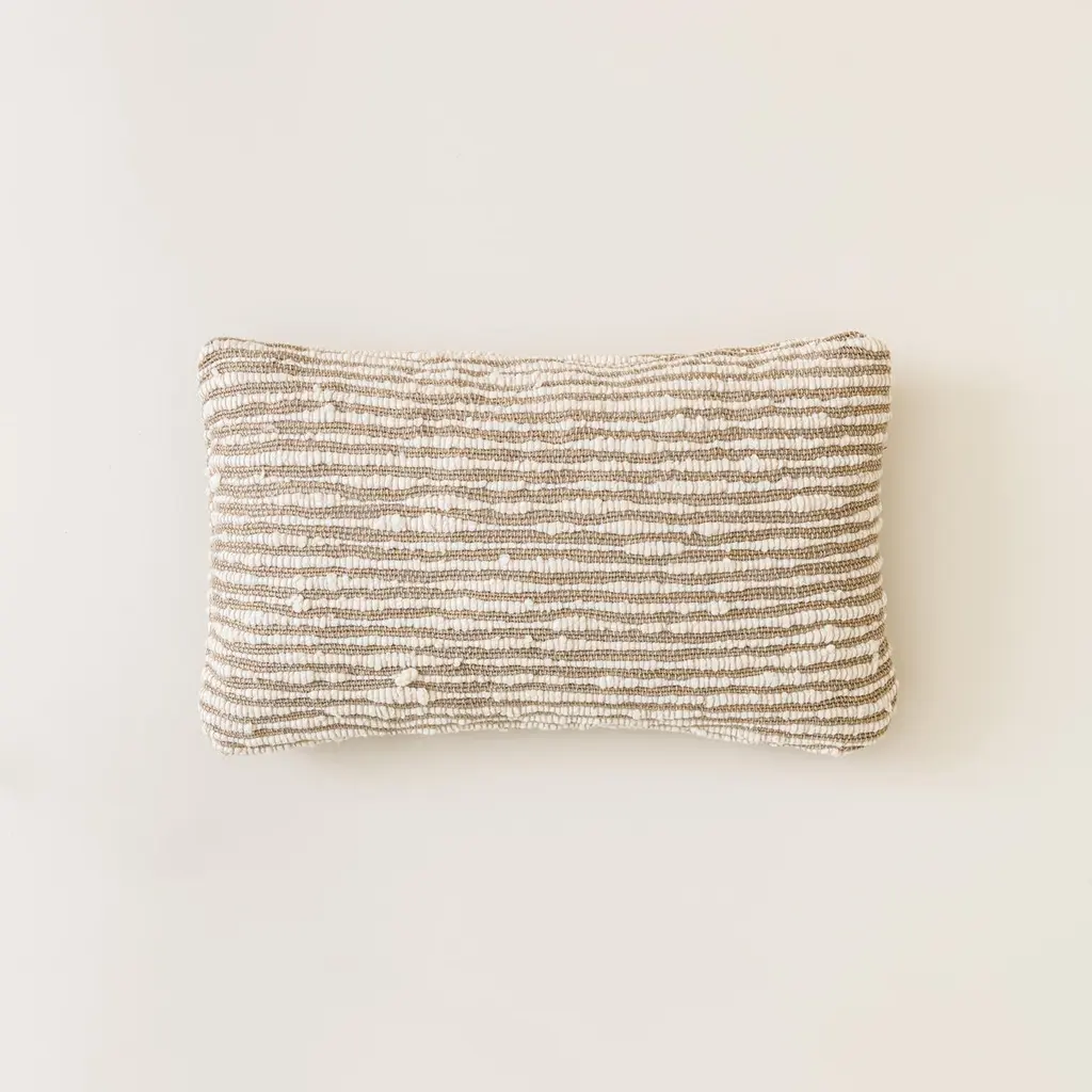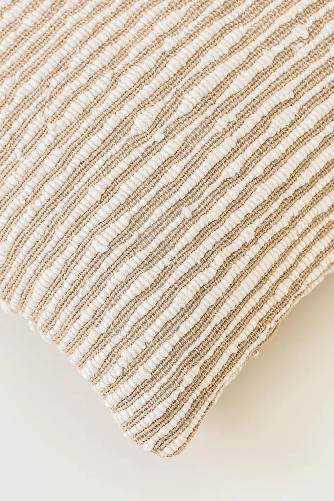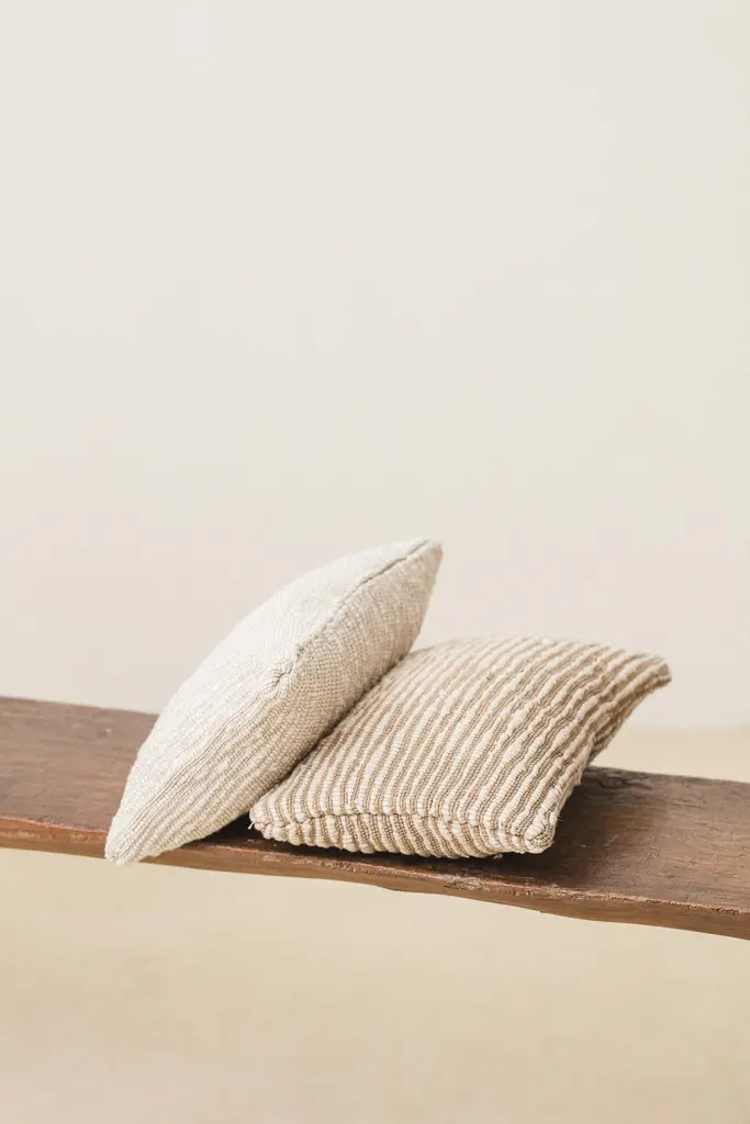 Taboa is meticulously handwoven using oversized organiz silk yarn, jute, and cotton, resulting in an exceptionally soft, textured material of exquisite quality. The fabric boasts a harmonious blend of natural fibers, creating a beautifully crafted finish. Our palette is composed of four naturally dyed colors: Castanha, Nozes, Cupuaçu, and Macadâmia. MacadâmiaTaboa - AN 12Fabric Cushion cover: 60% Silk +30% jute + 10 % cottonUnlimited