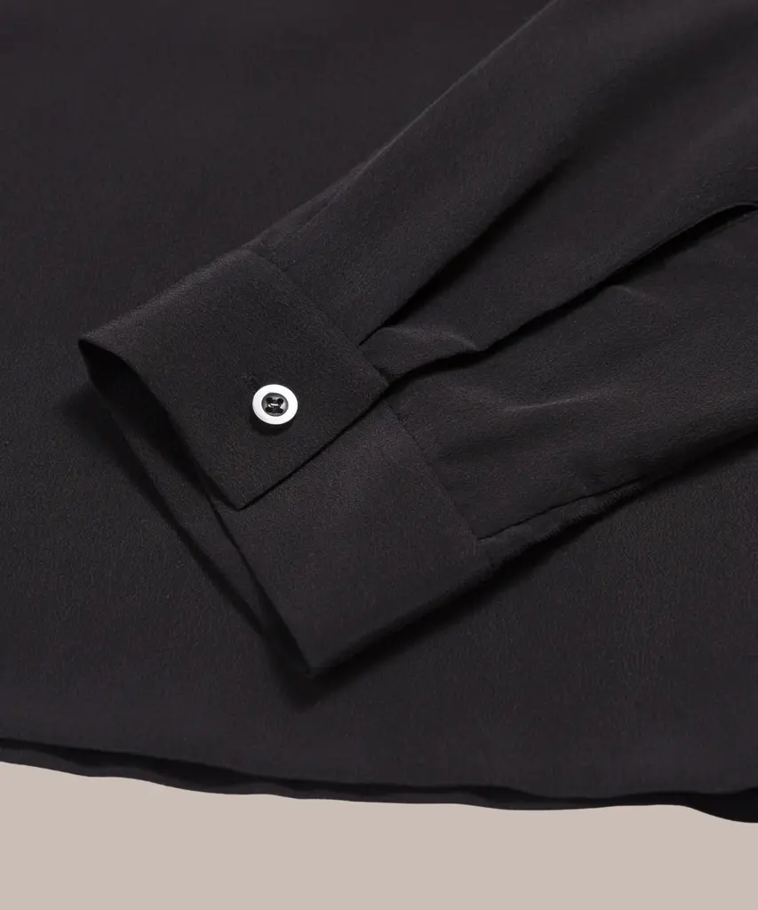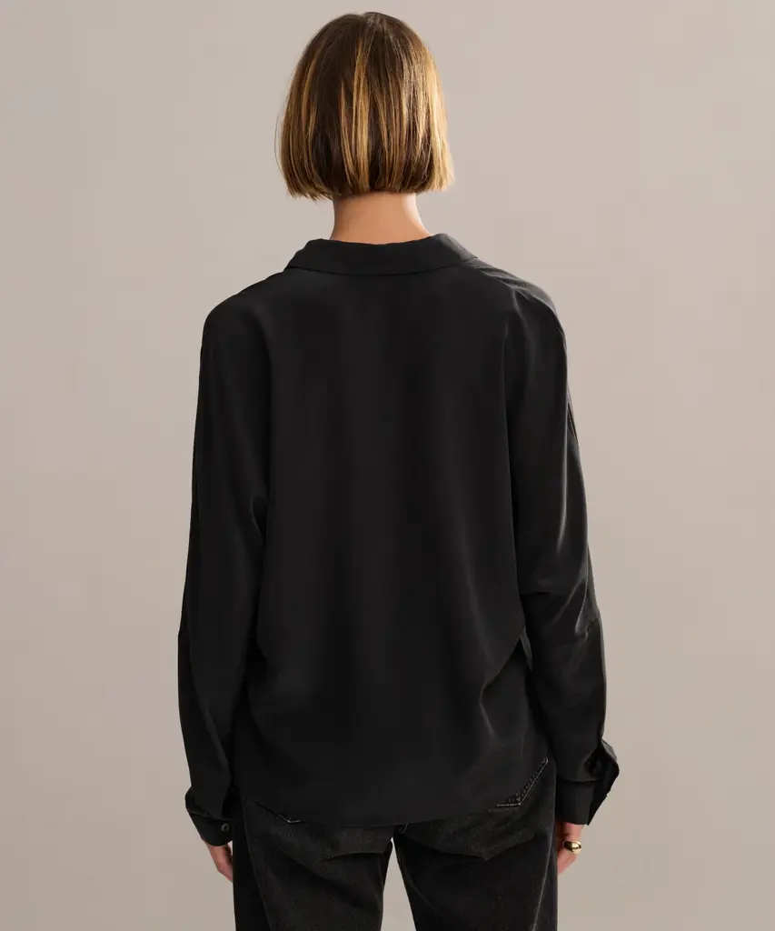 Silk Sloane Shirt Black This isn’t just a button-down—it’s the one you’ll reach for again and again. Crafted from light and fluid 100% sandwashed silk, it features a relaxed fit, dolman sleeves, and a single breast pocket. Pair it with the Wool Jones Trouser for a look that’s equal parts easy and elegant.