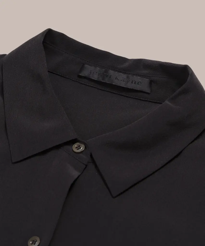 Silk Sloane Shirt Black This isn’t just a button-down—it’s the one you’ll reach for again and again. Crafted from light and fluid 100% sandwashed silk, it features a relaxed fit, dolman sleeves, and a single breast pocket. Pair it with the Wool Jones Trouser for a look that’s equal parts easy and elegant.