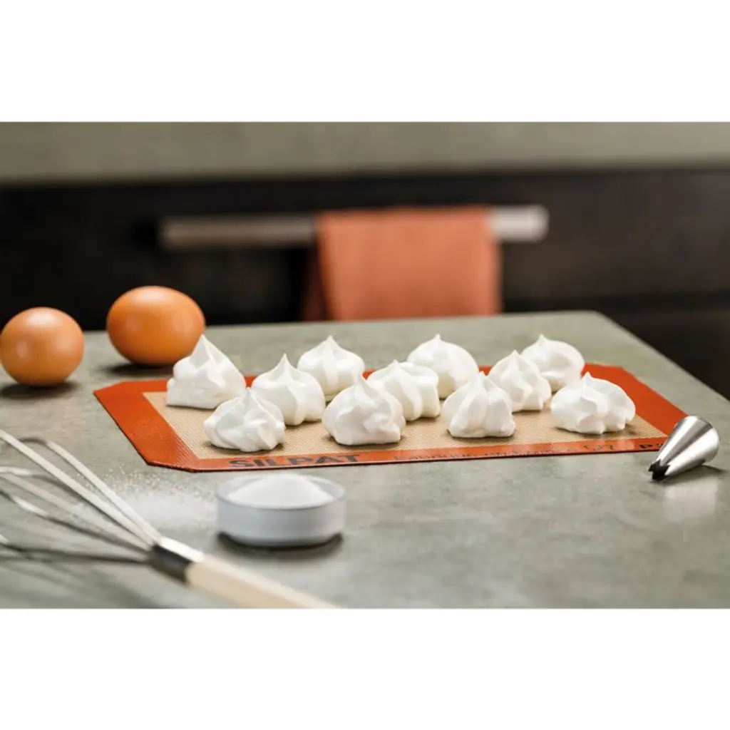 Invented by a French baker in 1965, the Silpat non-stick oven mat frees your baking from parchment sheets and greasy coatings. Made with food-grade silicone and reinforced fiberglass mesh, the quarter sheet mat cooks evenly, releases easily and bakes without the need for greasing cookware with butter or oil. To use, line a baking pan or cookie sheet with the mat, top with cookie dough, frozen appetizers or gooey pastries, and bake.