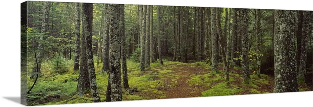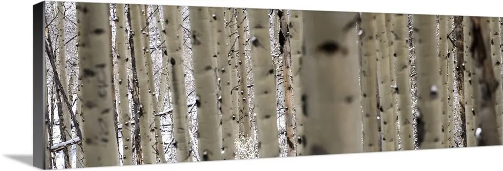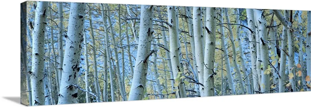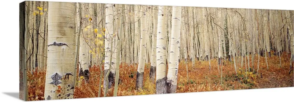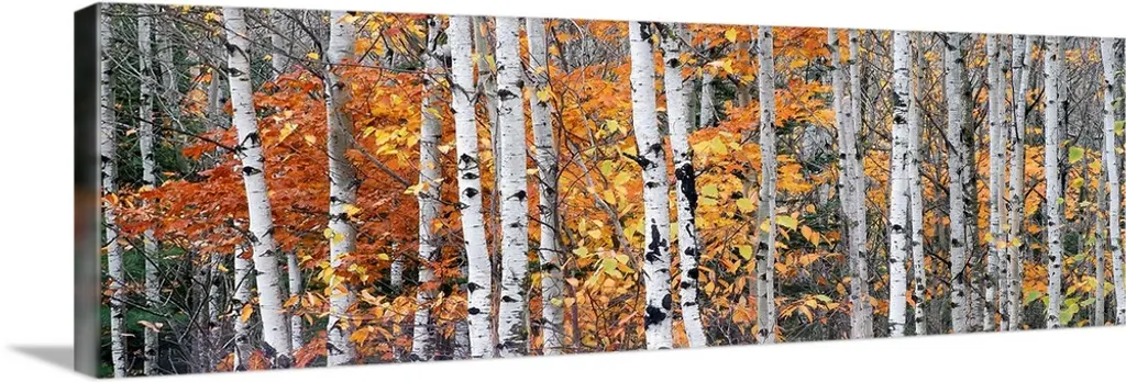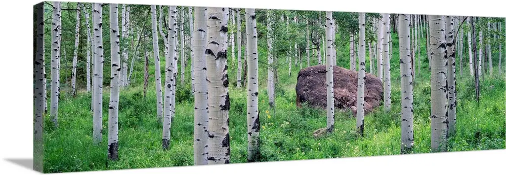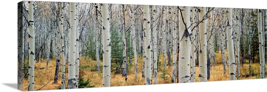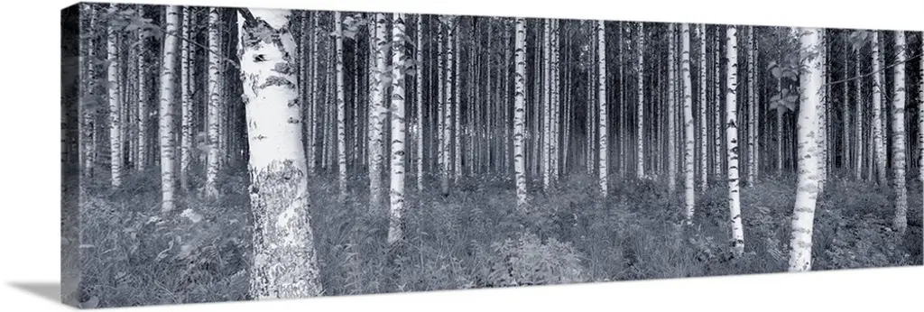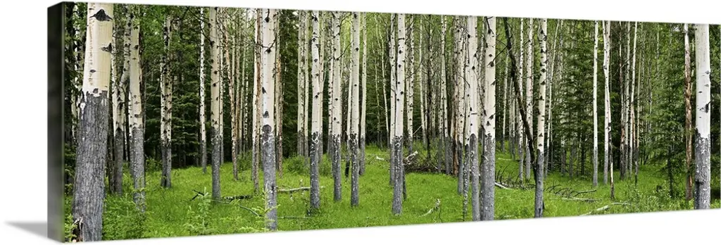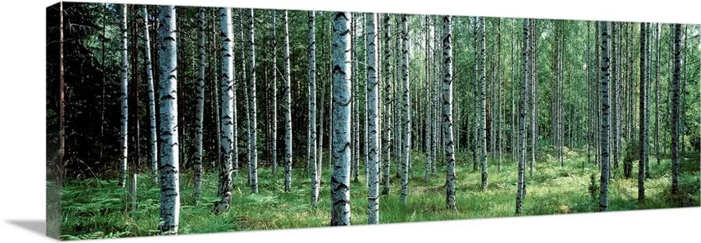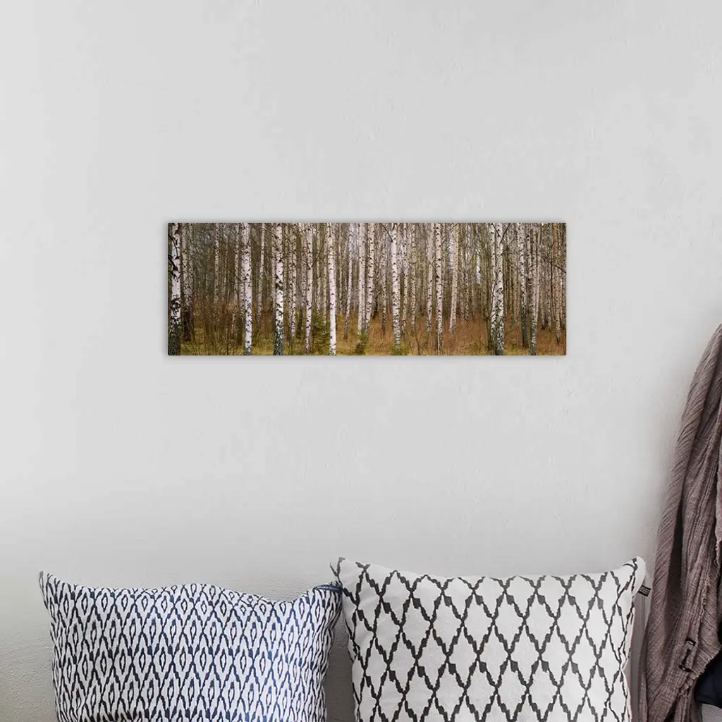 Wall art photograph of a forest dense with birch trees on a panoramic, landscape canvas.
