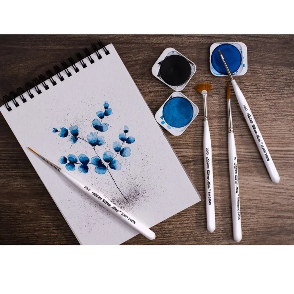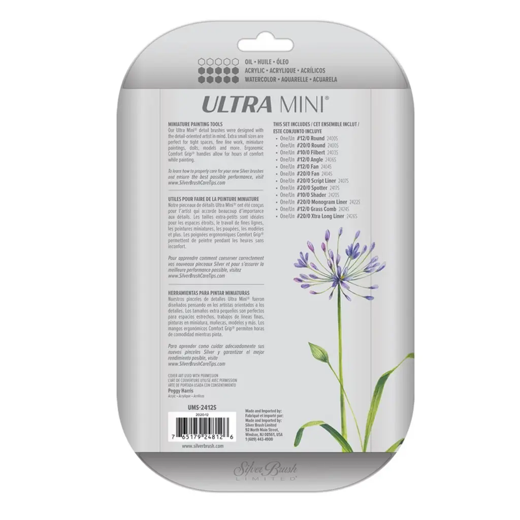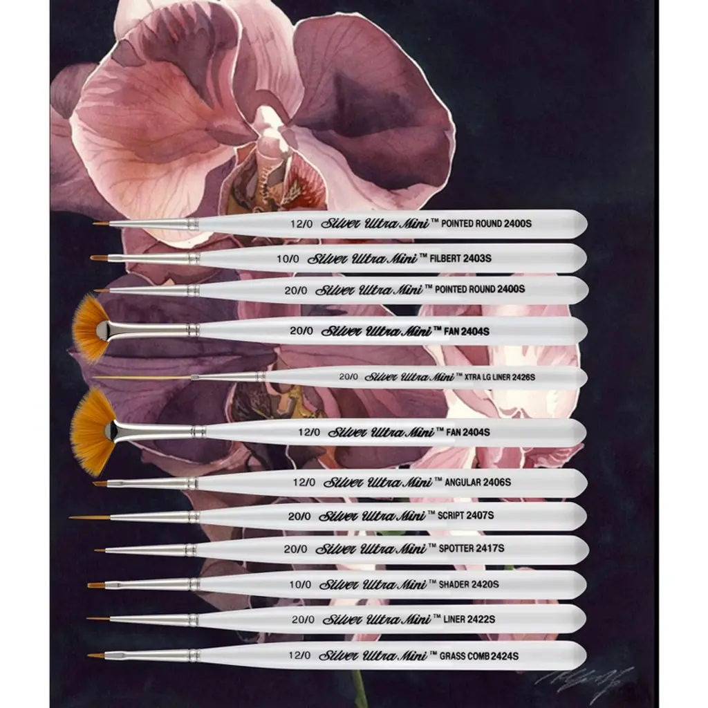 Silver Brush Ultra Mini® Miniature Detail 12-Piece Brush Set | These brushes were created for artists who use watercolor or acrylic paint. They feature golden Taklon filaments mounted onto pearly-white handles. Their ultrafine tips are good for creating tiny details and offer lots of control. Silver Brush Ultra Mini paintbrushes are expertly crafted with luxurious and precise golden Taklon filaments. Each brush has a short pearly-white Comfort Grip handle that is finished with a sophisticated nickel-plated brass ferrule. This kit includes the Xtra Long Liner 20/0, Filbert 10/0, Pointed Round 20/0, Angular 12/0, Fan 20/0, Script Liner 20/0, Spotter 20/0, Shader 10/0, Pointed Round 12/0, Monogram Liner 20/0, Fan 12/0, and Grass Comb 12/0. Each Ultra Mini brush can be paired with both watercolor and acrylic paint, proving that it is versatile. It will hold the right amount of color for precise details. Enjoy the controlled, colorful strokes. Silver Brush Ltd is owned by a 4th generation art materials family and proud of Silver Brush rich heritage in bringing quality supplies to artists and craftsmen throughout the world. We delight in challenging the status quo and putting Silver Brush experience to work for you because Art is for Everyone!