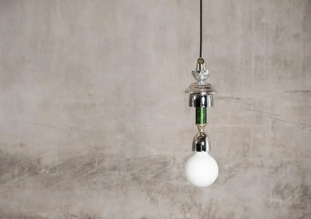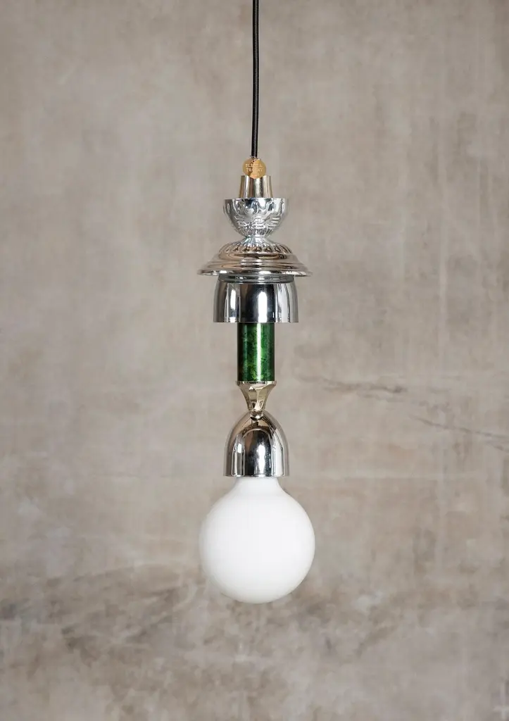 Silver, Green L3 Light by FléttaDimensions: 34 x 4 cmMaterials: silverTrophy is a collection of tables, lights, flowerpots and shelves made of old trophies collected from athletes and sports clubs in Iceland. Trophies are a part of big moments in people’s lives, achievements, and memories. They tell a story of countless hours and strenuous exercises. They are made for a moment, when they are lifted up in triumph.Designers Birta Rós Brynjólfsdóttir and Hrefna Sigurðardóttir founded Flétta in 2018 but have been working together since 2014. Both with backgrounds in product design from Iceland University of the Arts, they bring a high degree of conceptual and process innovation to their works using mundane or often overlookedproducts and materials. Their practice revolves around responsible design, utilizing reused materials and local production with evident respect for craftsmanship and storytelling.
