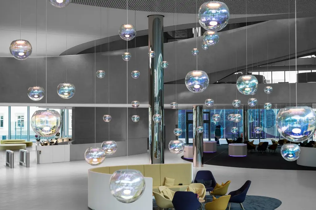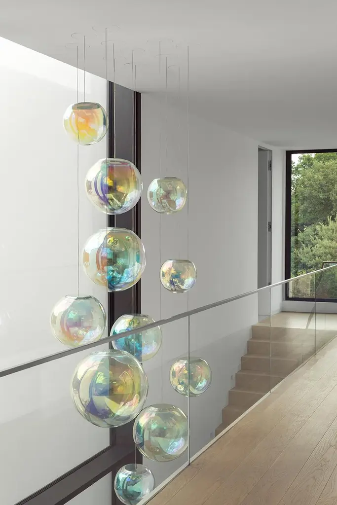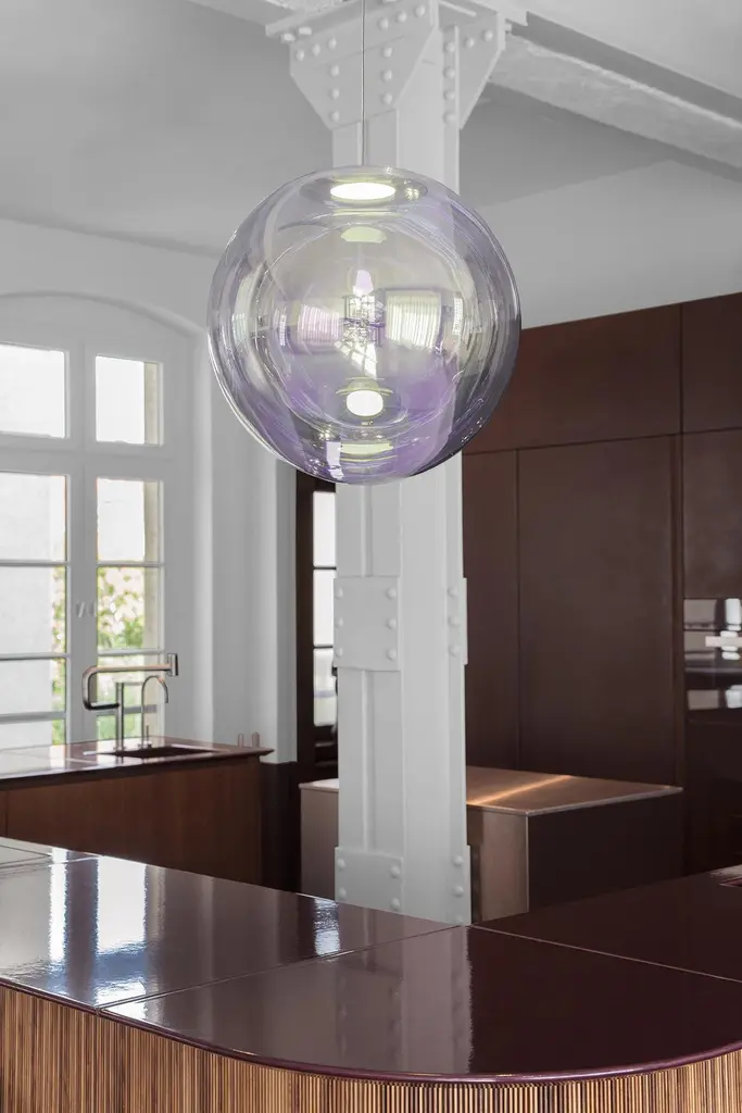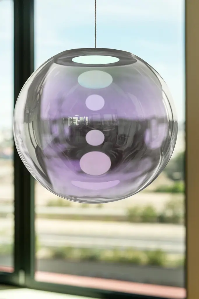 Silver-Lilac Iris Globe "30" by Sebastian SchererHandmadeDimensions: Ø 30 cm.Design: Sebastian SchererMaterial: Dichroic-coated mouth-blown glass, stainless steel.Colour: silver-lilacAvailable in gold-indigo, blue-orange, pink-green, cyan-magenta, silver-lilac, and clear.Available in 25, 30, 35, 40, 45, and 50 cm.Also available in brass.Traditional glass production in the oldest glassworks of Germany The result of ambitious craftsmanship and technological innovation, the Iris pendant light mimics a permanent iridescent soap bubble. An OLED module provides both the light source and mount. A dichroic coating, applied using a process developed specifically for Iris, creates the impression of movement and ever-changing colours.Awards: Grand Price Lexus Design Award 2014Winner Interior Innovation Award 2015Winner German Design Award 2016.