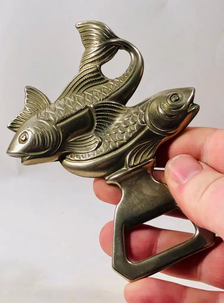 A bottle opener from the 1970s, in silver-plated metal, themed around the signs of the zodiac, depicting the Pisces sign.An item that is both functional and decorative, ideal for collectors or enthusiasts of vintage design and astrology.Great patina.