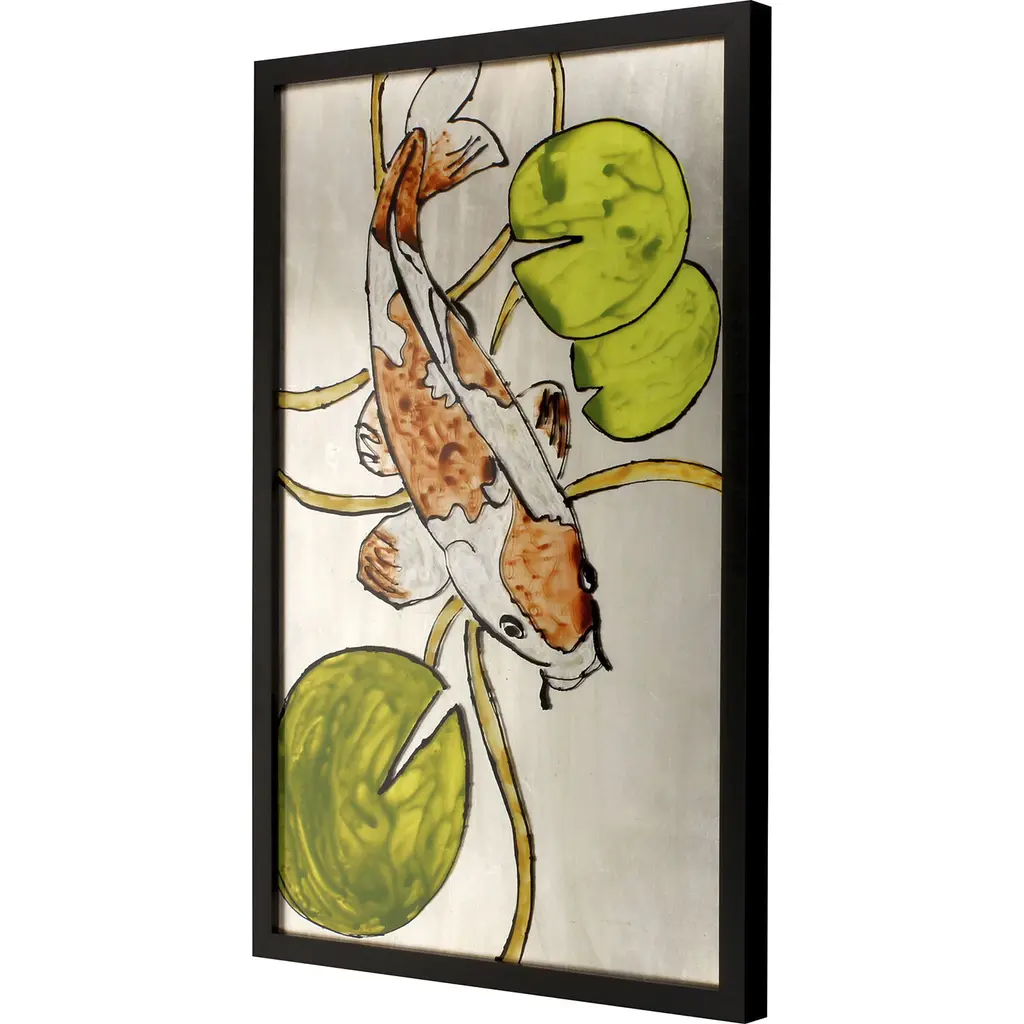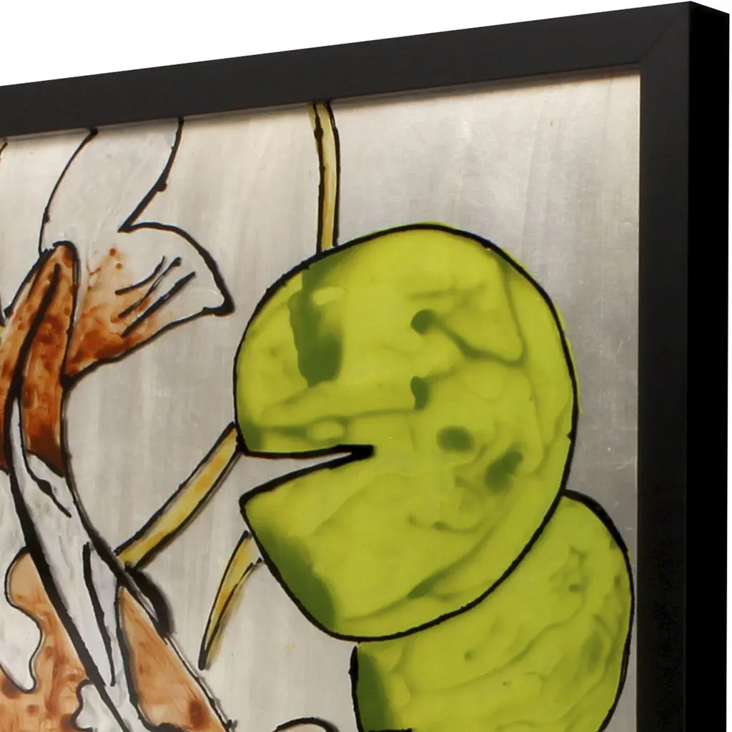 Exclusive reverse hand painted on acrylic. Framed in a black matte wood shadow box style moulding.