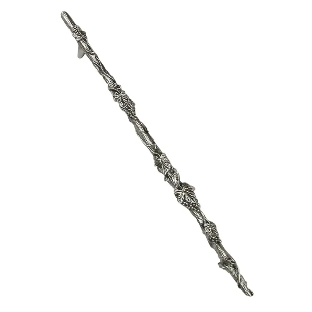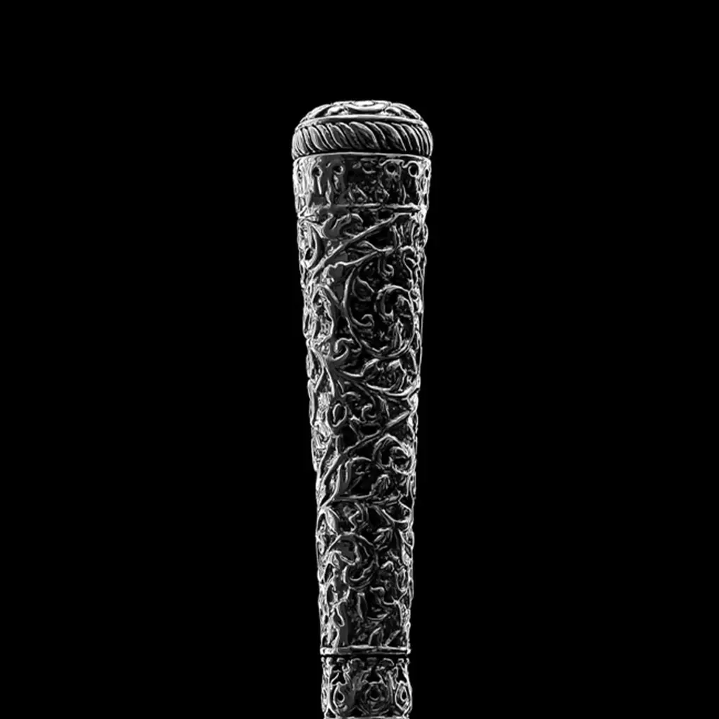 Characterized by an elegant and classic design, this stick features a metal handle richly decorated with elegant patterns embossed on the surface. The conical shaft of this sophisticated accessory is crafted in gloss black beech wood and has a silver-plated brass tip with protective rubber end. This is a collectible item, not to be used for walking.