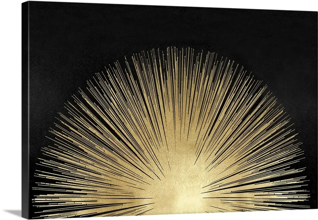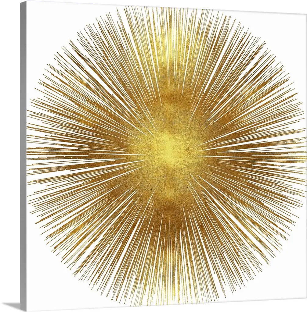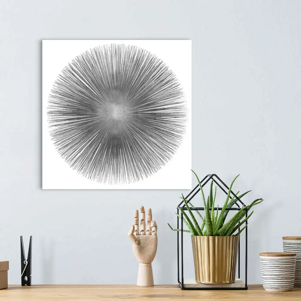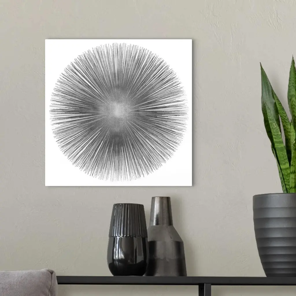 Square decor with a circular shape made out of thin silver lines angled out and disappearing into the silver center on a dark white.