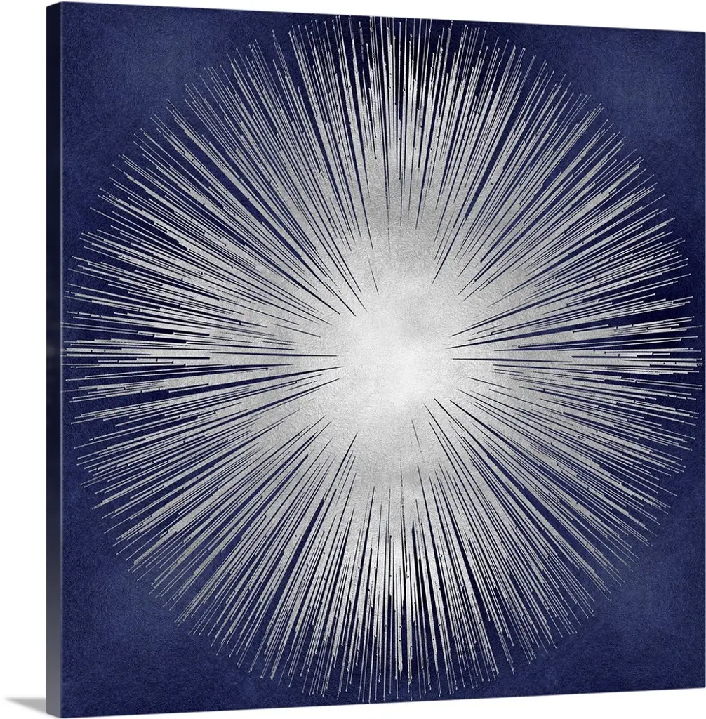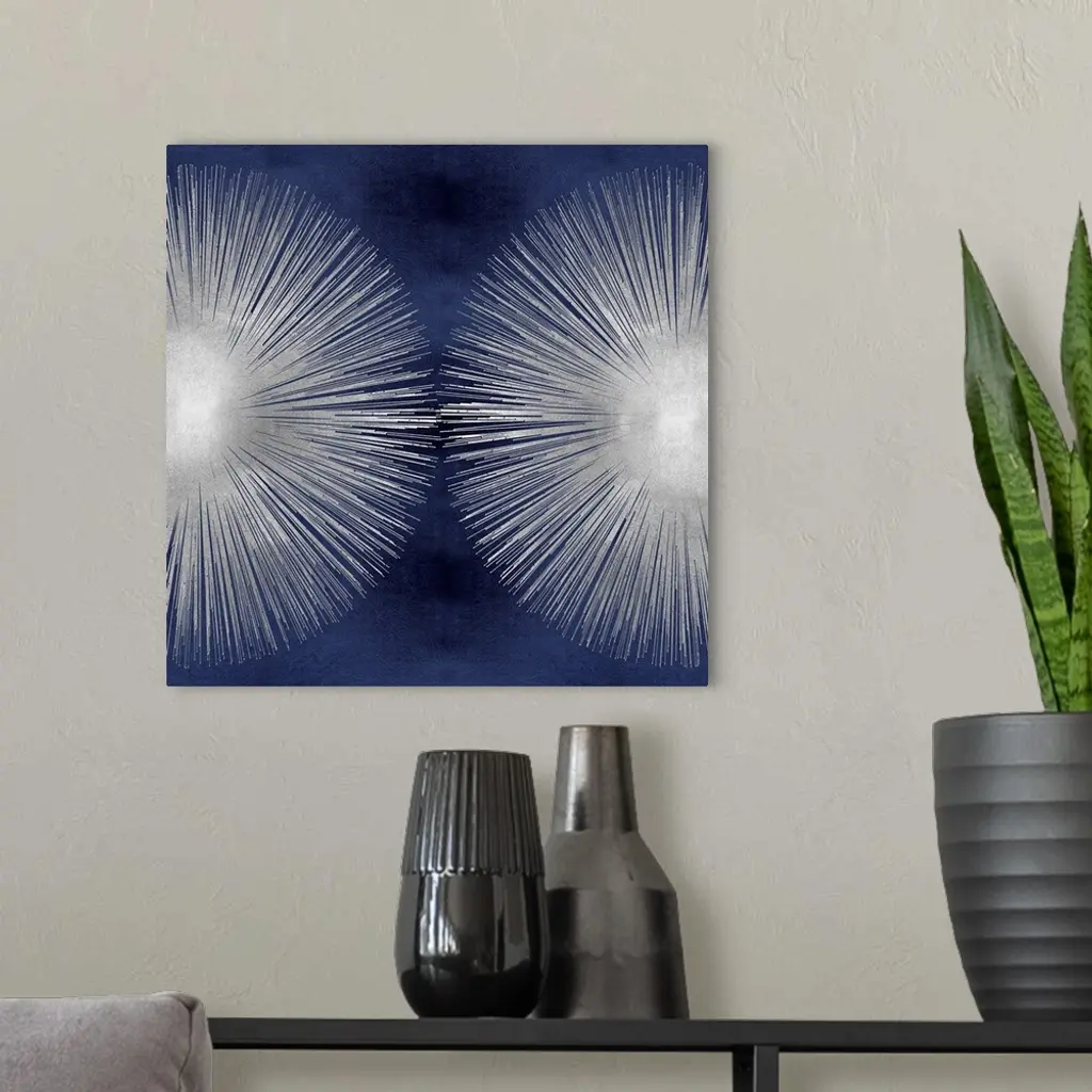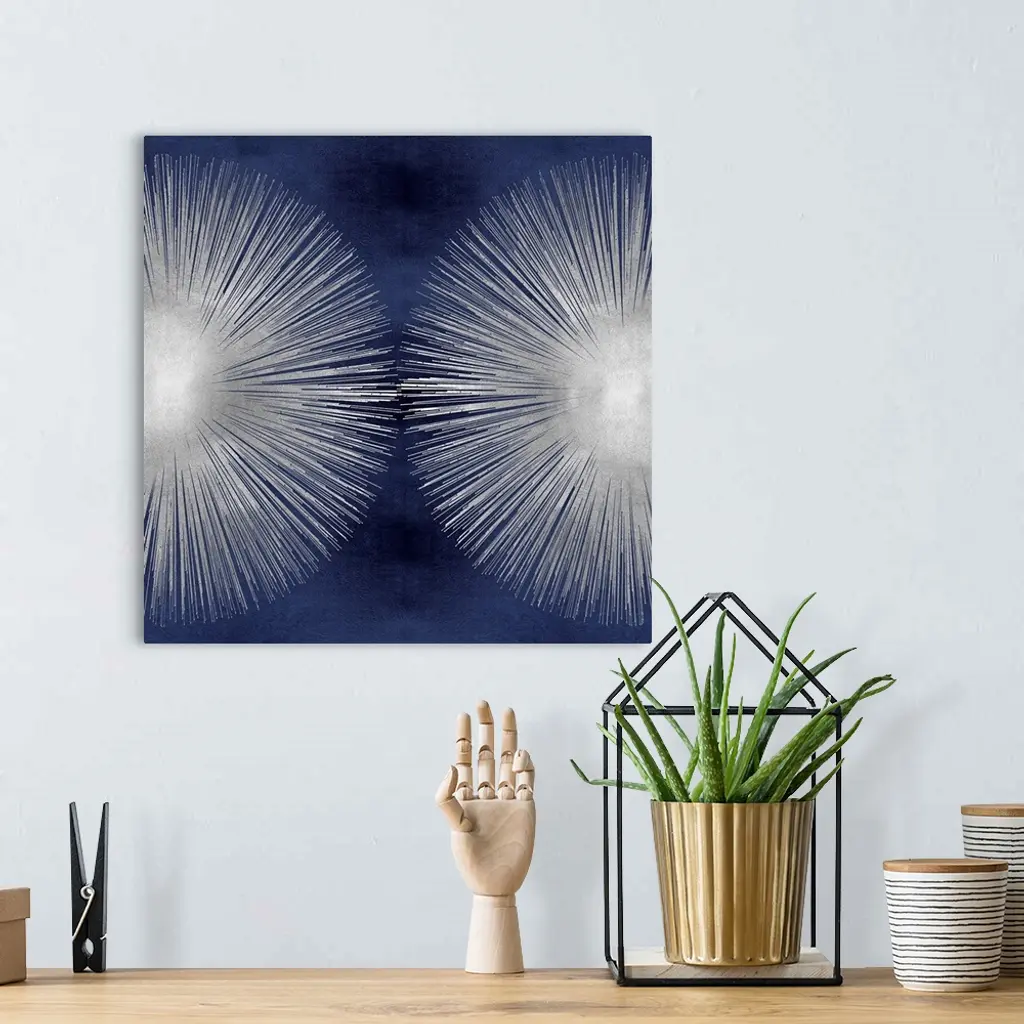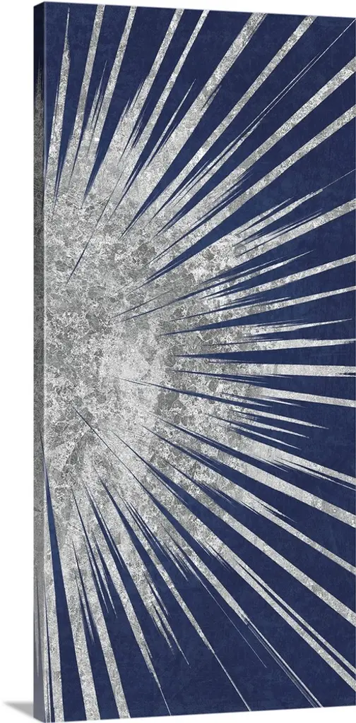 Square decor with two circular shapes made out of thin silver lines angled out and disappearing into the silver center on a dark blue background.