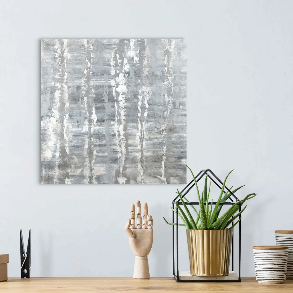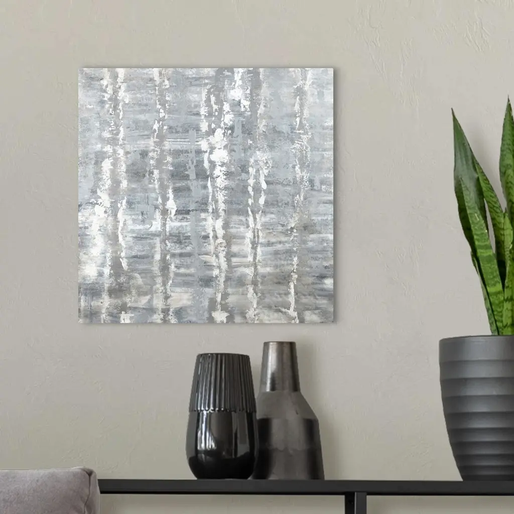 Square abstract art with horizontal brushstrokes in the background and vertical lines in the foreground, all in silver, gray, and white hues.