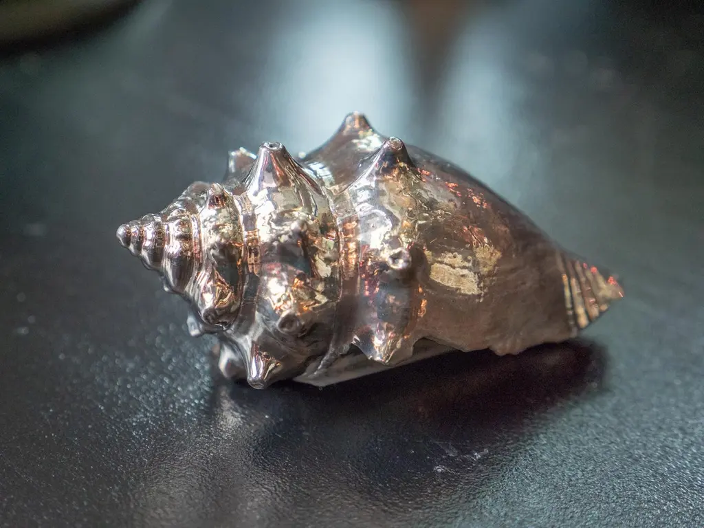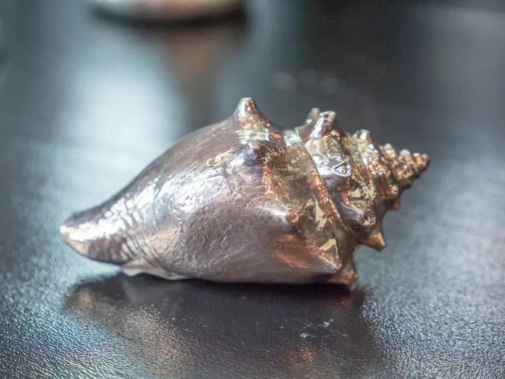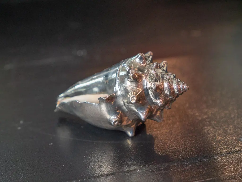 Strombus pugilis fully silvered shell. Creel and Gow has been working with the same atelier in Rome, Italy for over 20 years to make our signature silvered shells. Our workshop has been operated by the same family for generations, and for decades has also done restoration work on silver pieces for the Vatican.