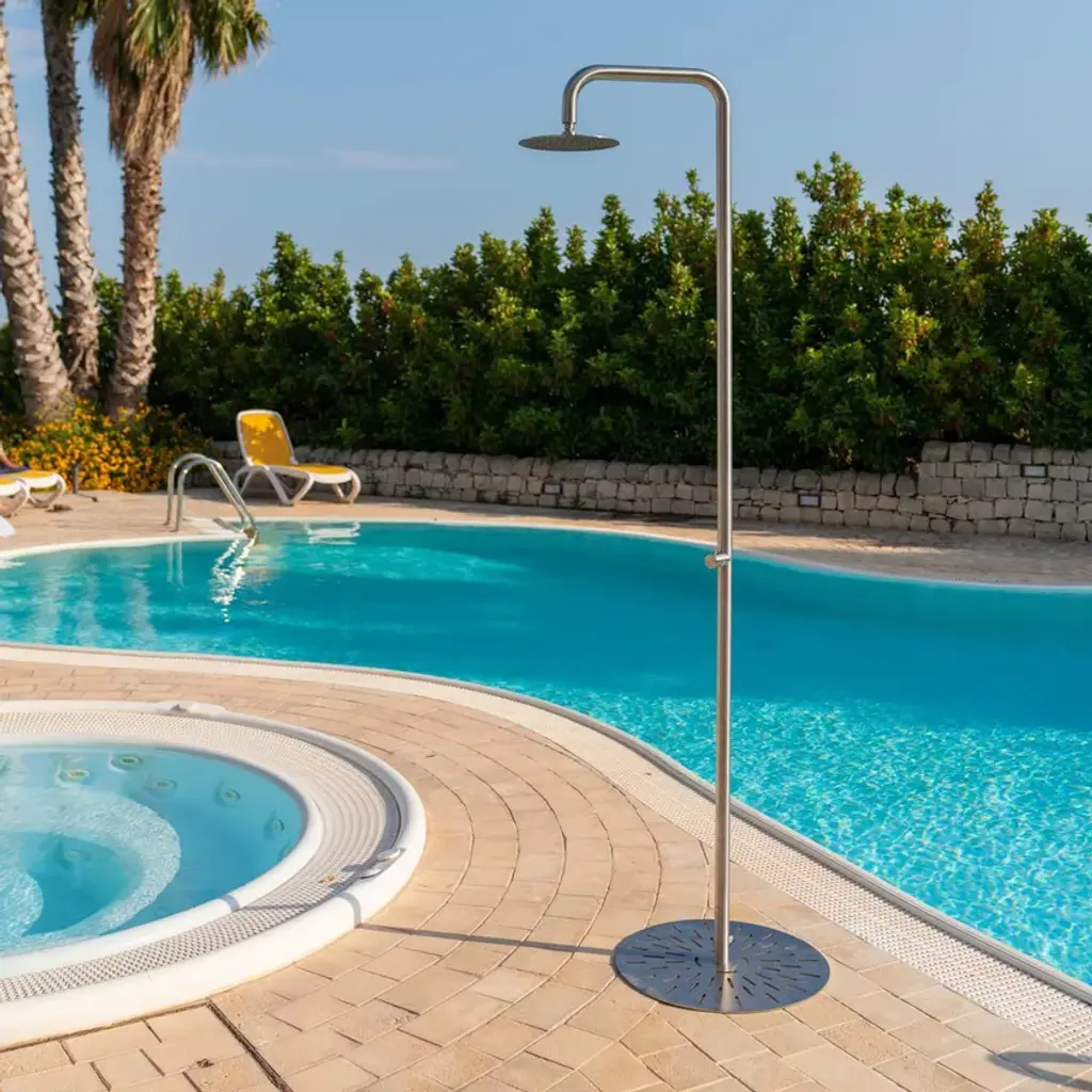 SIMIUS is a classic shower for swimming pool Sined of high quality only cold water, the stainless steel shower has been thought and realized for any outdoor installation. The shower model SIMIUS INOX is a shower in Satin Stainless Steel Aisi Inox 316L with only cold water inlet. The shower for outside is excellent for commercial use, private, for outdoor swimming pool, garden or for the bathroom at home. Height 230 cm. diameter 38 mm.Features:Cold water only.Aisi 316L stainless steel taps.Lateral water connection cold water only std half inch connection.The round base is very wide and allows the shower to be placed on the floor without the need to fix it with dowelsThe steel used is high quality Aisi Inox 316L, also known as marine steel, which is better than AISI 316. It differs from AISI 316 stainless steel due to the lower amount of carbon present, L stands for “low carbon”. This makes the steels in this series particularly resistant to corrosion (especially pitting) even in particularly reducing, highly saline environments, guaranteeing excellent resistance to corrosion.Unlike solar-heated outdoor showers, you don`t have to worry about placing this shower in direct sunlight. The only limitation is your choice.Italian StyleSined presents the new line of garden and swimming pool showers and the new line of outdoor furniture. High quality, care for design, attention to the smallest detail and uniqueness, which characterize all the Italian excellences so appreciated in the world.Although industrially manufactured, everything is created by an Italian studio and under strict supply chain directives such as the control of the various samples tested in Italy, up to the complete product and its certification.The internal design was followed by a staff of Italian specialists, who analysed every single component, considering possible problems and studying solutions to prevent them. Everything to define high-end products!Everything is made from the highest quality materials. Every single component has been selected with extreme care. The products are marketed with a series of useful, not to say indispensable, accessories that are normally paid for separately.The physical production was then entrusted to an Asian factory with a great deal of know-how, and internationally recognised for its extremely precise quality control. The production facilities and state-of-the-art machinery used are so expensive that only such large economies of scale can sustain them.You won`t find the same technical features and accessories on the market that SINED offers its customers.PositioningWe recommend installing the large shower plate on a solid, perfectly flat and level support that can support the weight of the shower and prevent it from falling, such as a concrete floor, stone, concrete base, etc.Some adviceStainless steel showers are particularly susceptible to impurities and limescale and, if installed outdoors, to low temperatures during the winter.– It is recommended to purge the system before connecting the water pipes to prevent dirt and impurities from getting into the shower and causing it to malfunction.– To prevent the formation of limescale, we strongly recommend installing a special filter at the water inlets and periodically cleaning the shower, the nozzles and the shower head.– Before the winter period or if the shower is not used for a longer period of time, it is recommended to turn off the water supply and empty the shower completely. It is also advisable to dismantle the shower and store it during the winter period or to protect it with suitable covers.