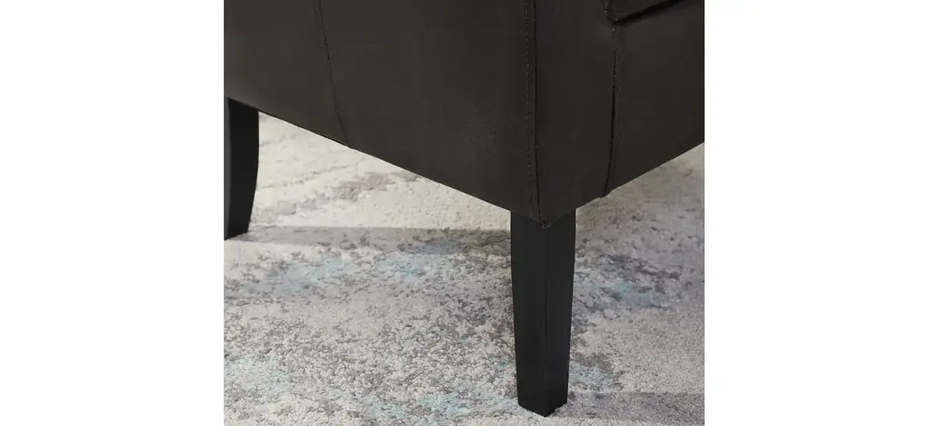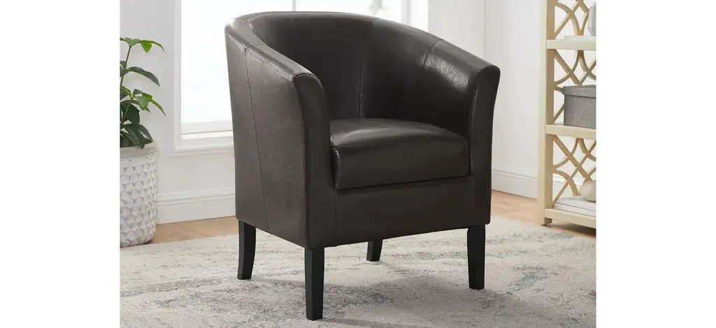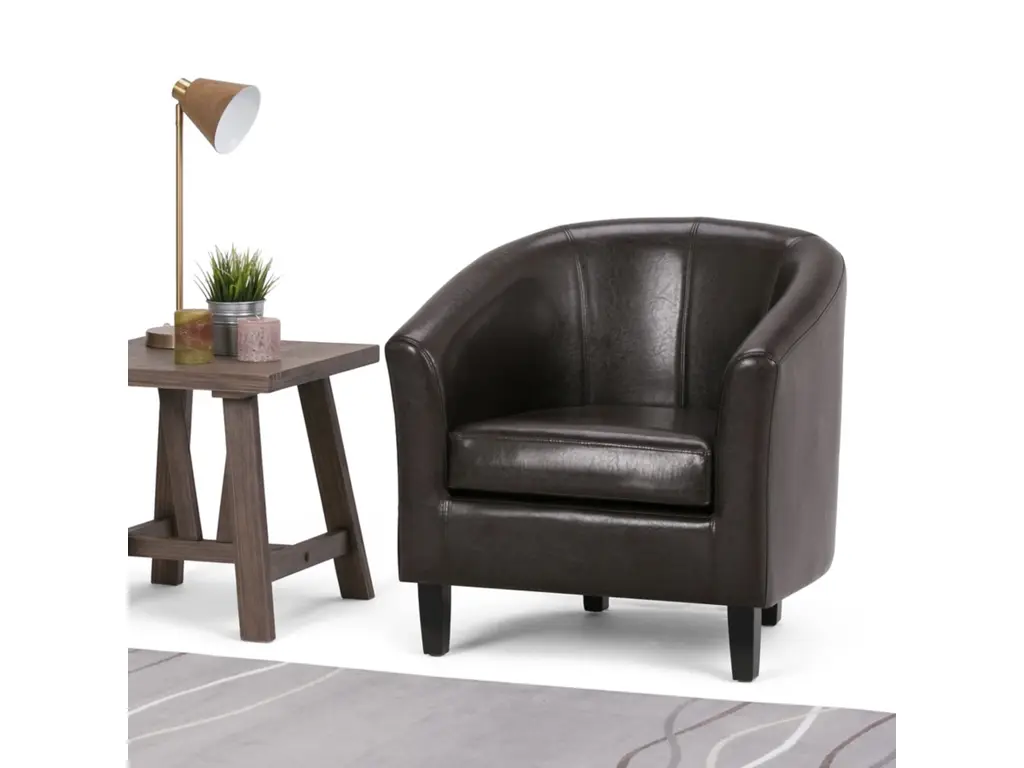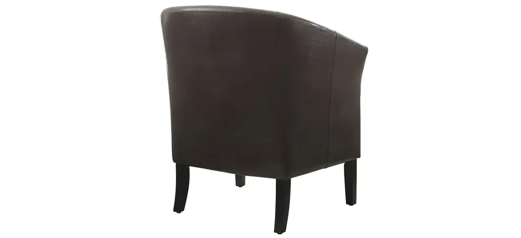 This modern Simon Club Chair features high arms and a deep seat, while the arching backrest and flared armrests provide a retro-modern design that is perfect for any setting. The chair is accentuated by tightly woven stitching and upholstered with stain and fade resistant wipe-clean vinyl. The hardwood frame will provide strength and stability for years to come. The arms and back are generously padded for extra comfort.