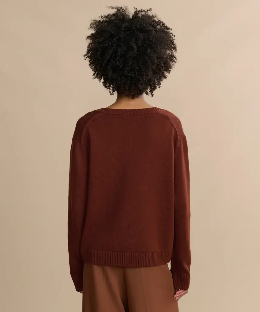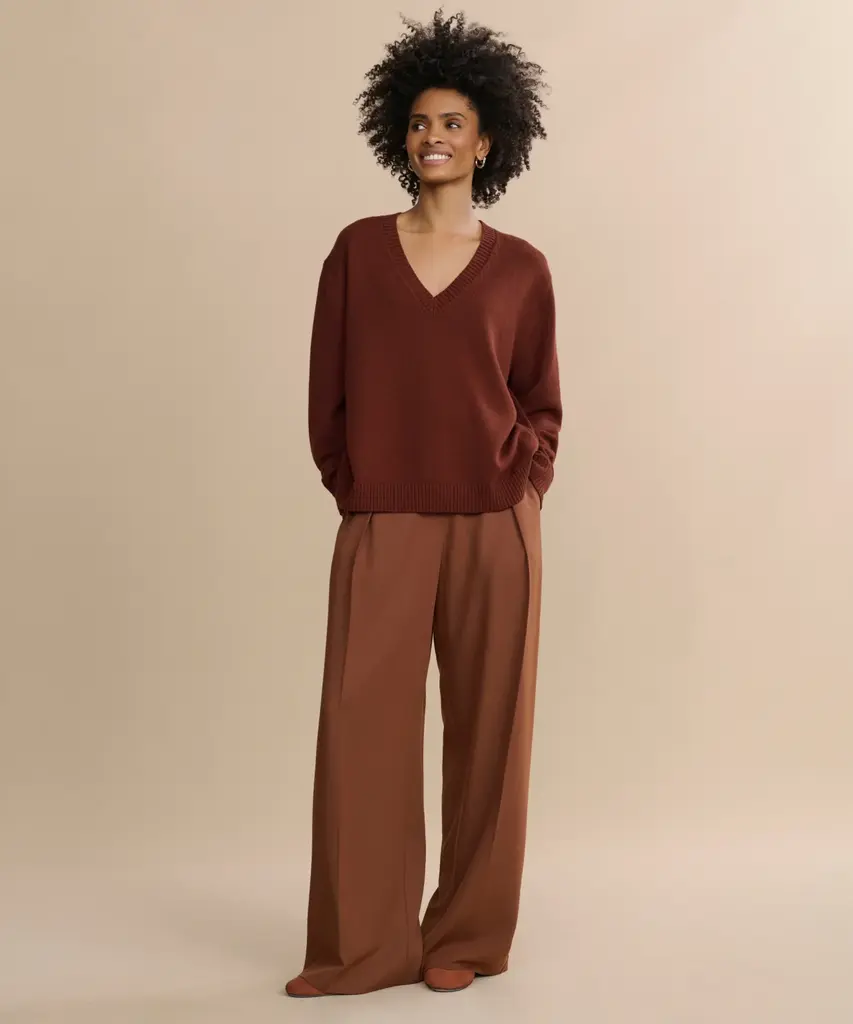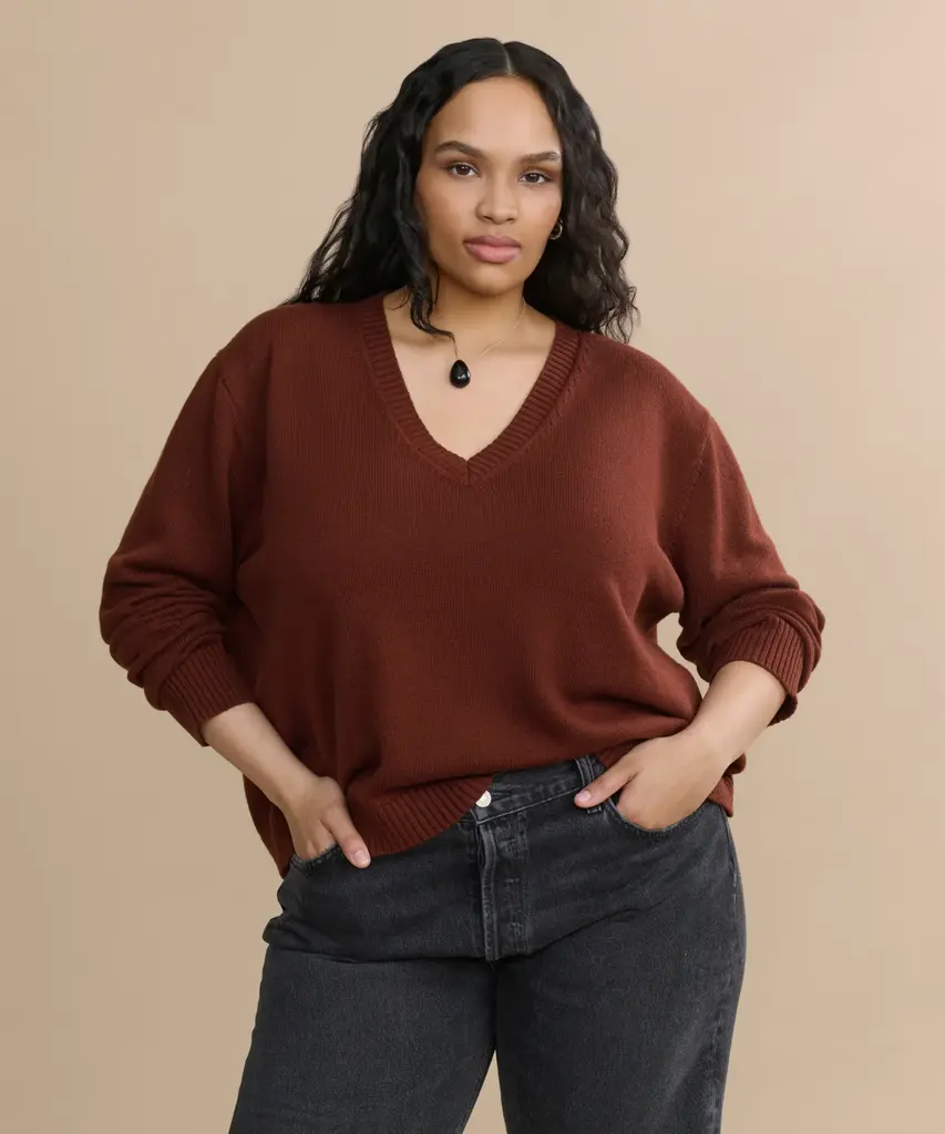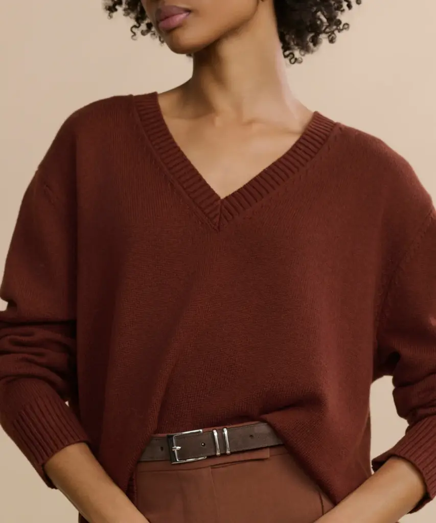Simone V-Neck Rust Our refined take on an everyday layer, fashioned from a luxe new blend of fine cotton and merino. Naturally breathable with a cool touch and a soft, relaxed drape—it’s the kind of piece that looks and feels like pure luxury.