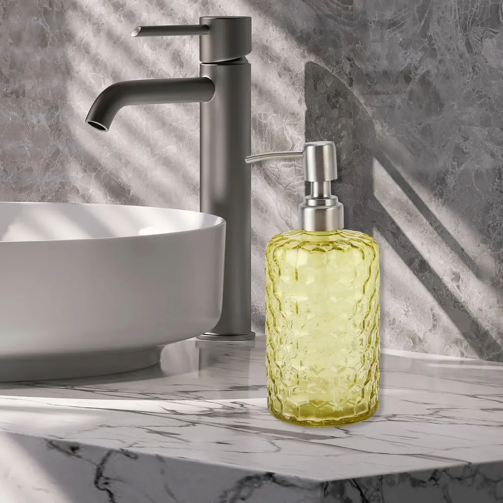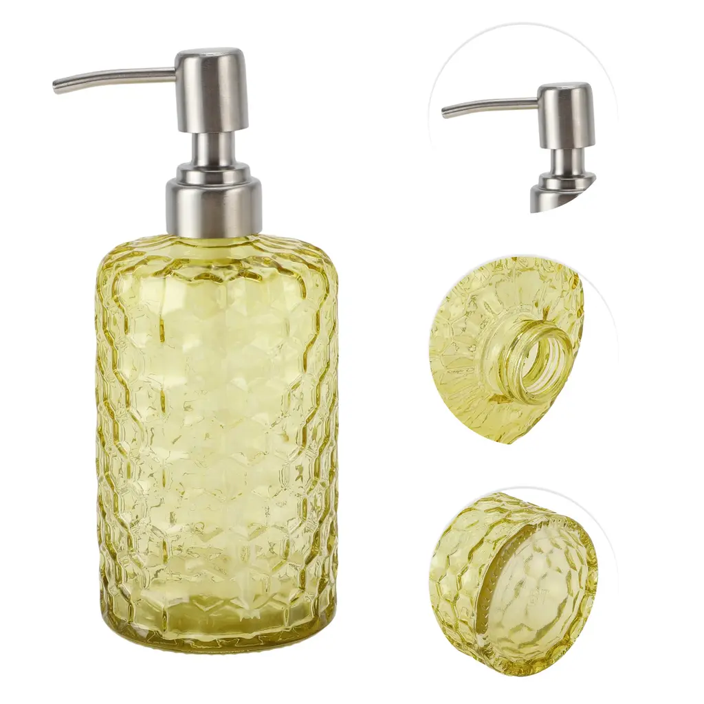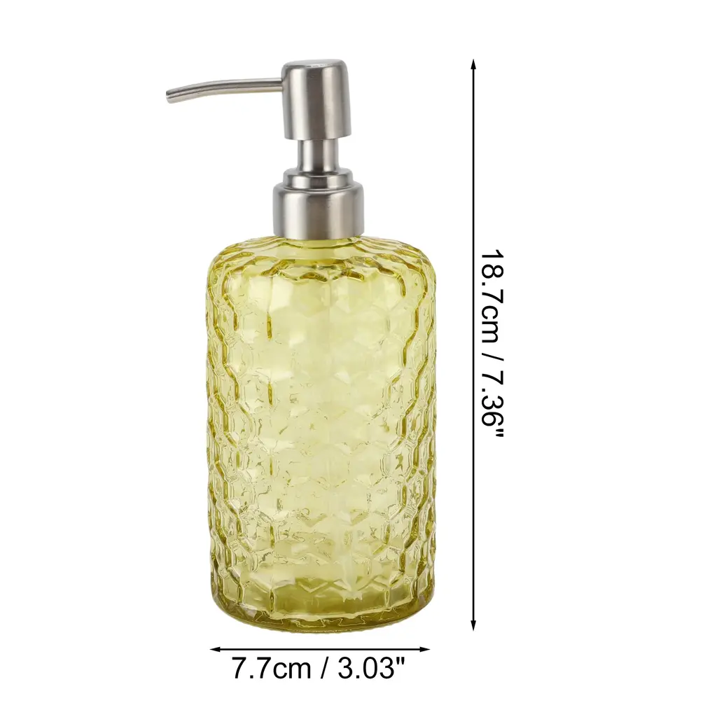 Unique Bargains 1 Pc Simple Cylindrical Soap Pump Dispenser for Bath 500ml Yellow Silver ToneLiquid soap dispensers are a more stylish home decor for kitchen and bathroom countertops.Stylish and modern design, simple yet elegant, adding a touch of sophistication to everyday essentials.Easy to pump, falls well on hands when pressed and does not spray on clothes.Color: Yellow, Silver Tone, Material: Glass, Size: 18.7x7.7cm / 7.36"x3.03"(H*D)Package Included: 1 Pc Soap Pump Dispenser.
