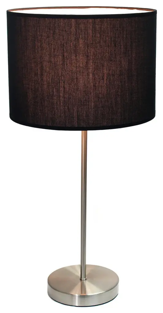 Simple Designs Brushed Nickel Stick Lamp with Fabric Shade, Black.This contemporary stick lamp features a brushed nickel base and a fabric drum shade. This lamp will add a modern touch to any space. Perfect for living room, bedroom, dorm, office, or anywhere you need to add fashion lighting.Brushed Nickel BaseFabric shadeConvenient On/off cord switchShade Diameter: 11" x Height: 22.4"ULBulb Type: IncandescentSwitch Type: On/offSwitch Location: CordShade Top Opening: 11"Shade Bottom Opening: 11"Shade Height/Slant: 7.9Shade Security: Socket nutNumber of Lights: 1Maximum Wattage: 40Shade Material: FabricCord Color: ClearFinish/Color: Brushed Nickel/BlackPrimary Material (Leather, Metal, Wood): MetalBase Type: E26 Medium BaseBase Dimensions: 6 inch diameter base x 17.75" height without shadeHeight from Base to Shade: 17.75"Bulb Included: NoWe don''t sale in California