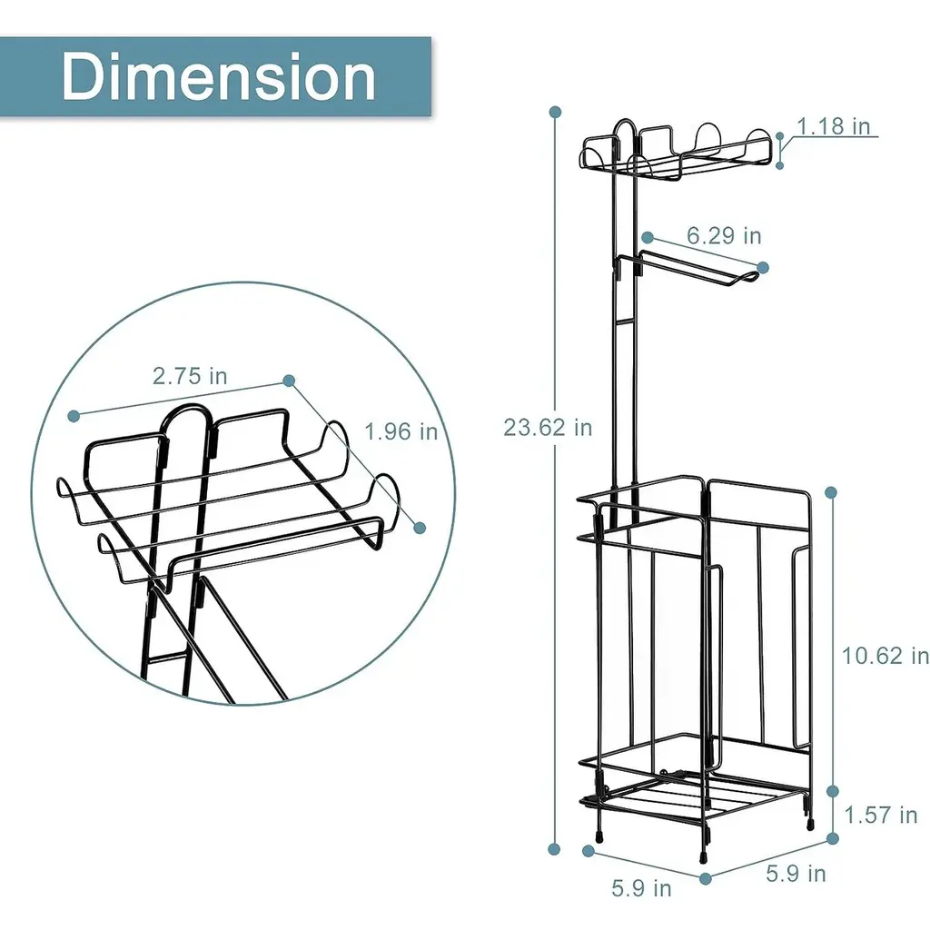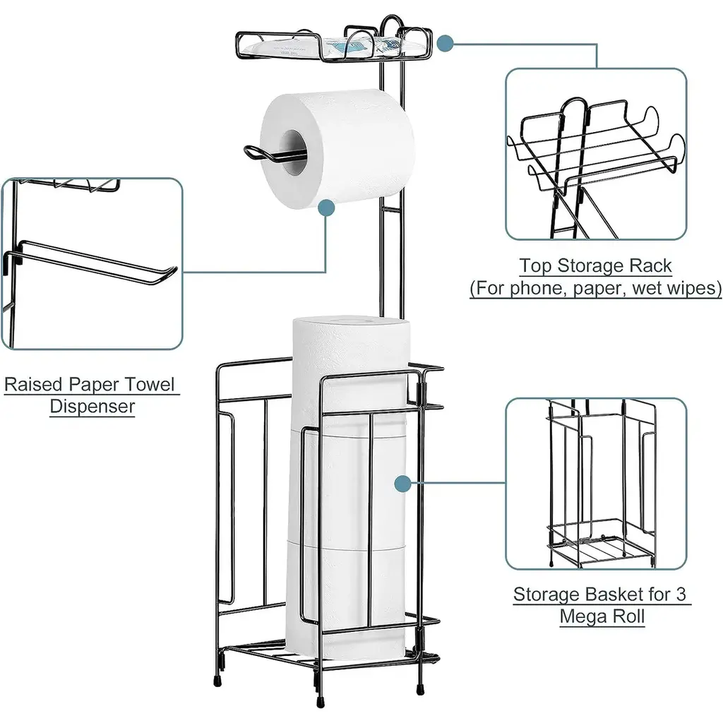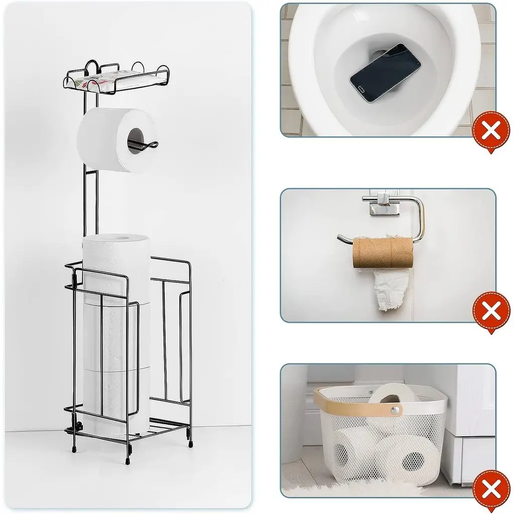 【Durable & Stable】The toilet paper holder stand is made of high-quality metal, durable and easy to clean. The industrial style is simple and atmospheric, suitable for various decoration styles. The bottom is equipped with four anti-skid pads, making it more stable, not easy to tilt and shake, and protect your floor from scratches. 【Extra Storage】Toilet paper stand with shelf is very practical, it can provide you with additional space. You can store mobile phones, wet tissue. The bottom suspension design prevent the paper towel from being wet by water, and the paper can always keep dry and clean. 【Large Capacity】This toilet paper roll holder stand is equipped with an L-shaped arms and vertical dispenser, which can accommodate 4 mega rolls. You no longer have to worry about running out of paper towels. And this is a great option for storing paper towels. 【Free-standing Design】This black toilet paper stand holder can be easily assembled without tools. No drilling or wall hanging required. This toilet paper holder with storage is easy to use and can be moved at any time, perfect for use in the bathroom and camper. Overall size: 5.9 x 5.9 x 23.6 IN.