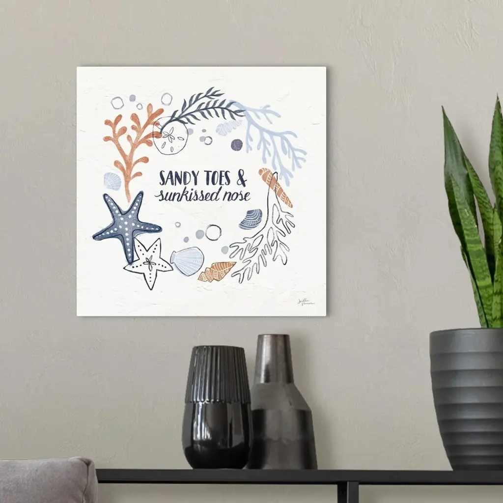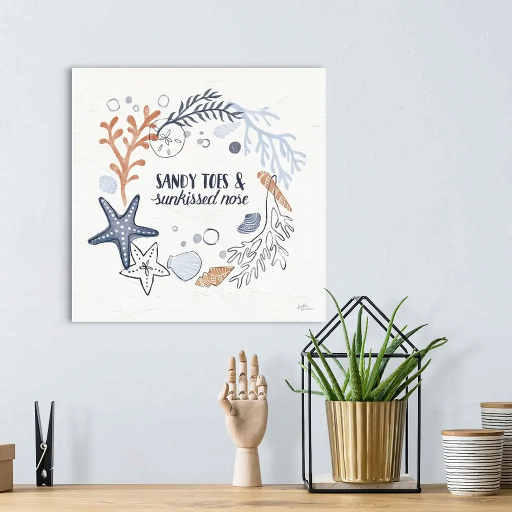 "Sandy Toes and Sun Kissed Nose" with coral and blue ocean themed illustrations on a square white textured background.
