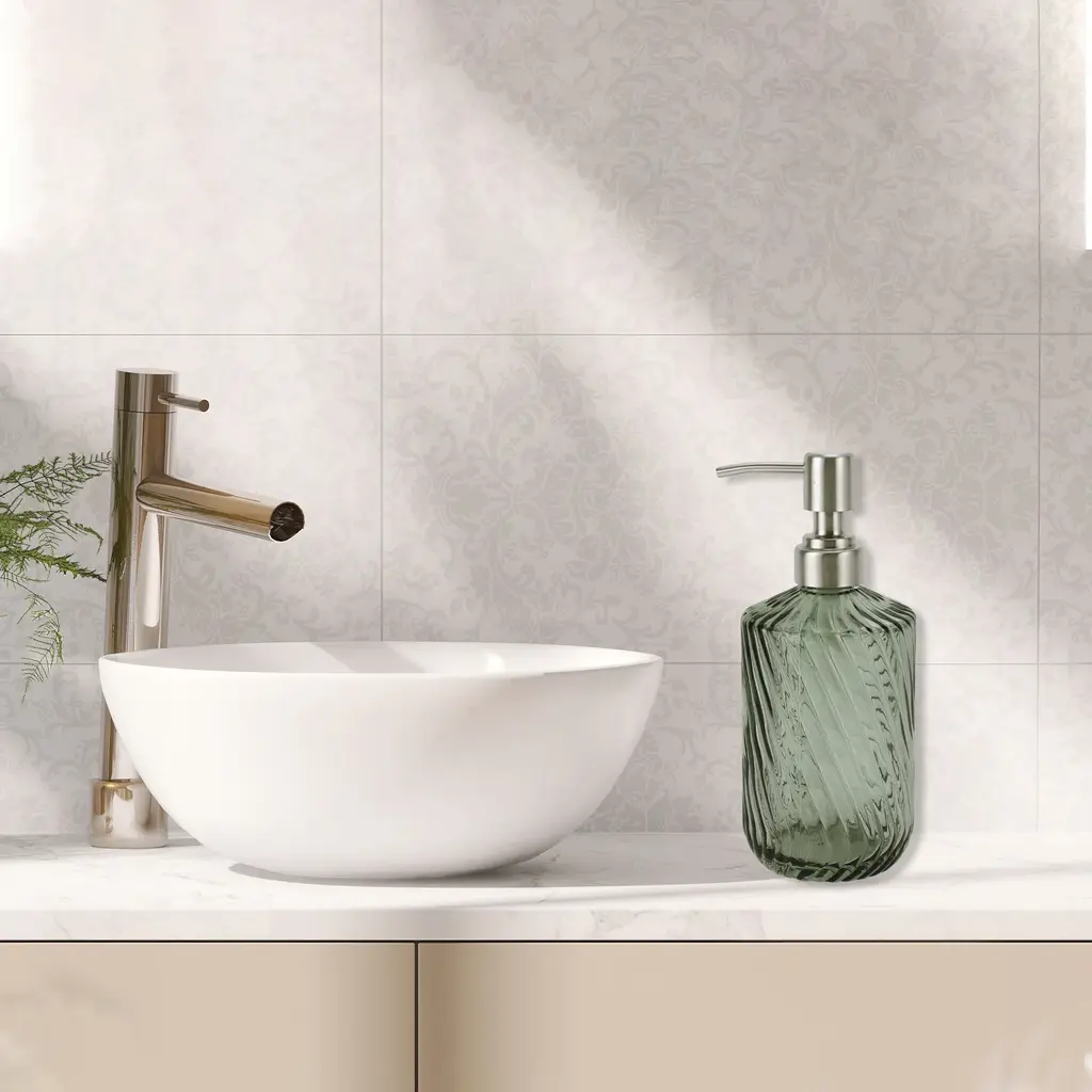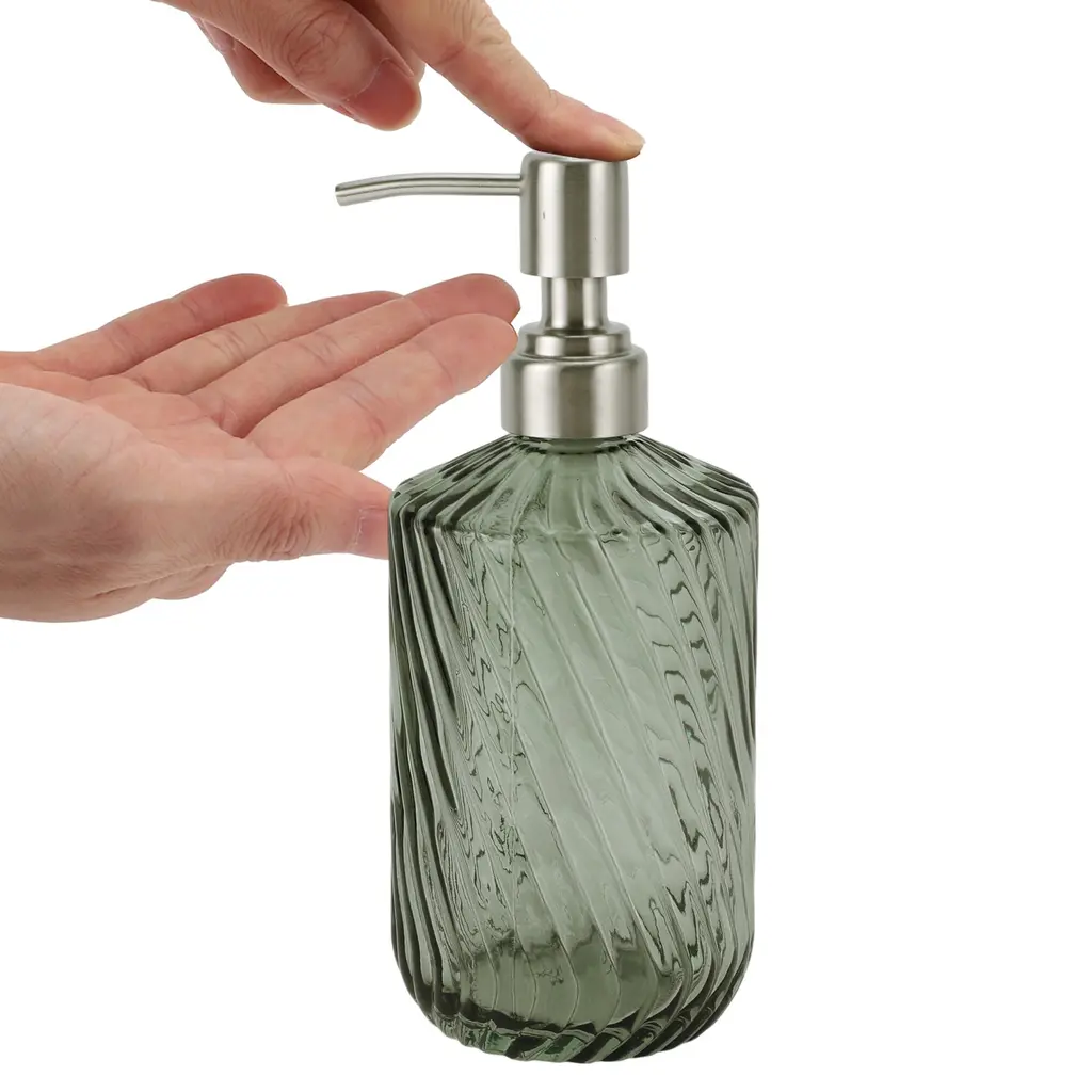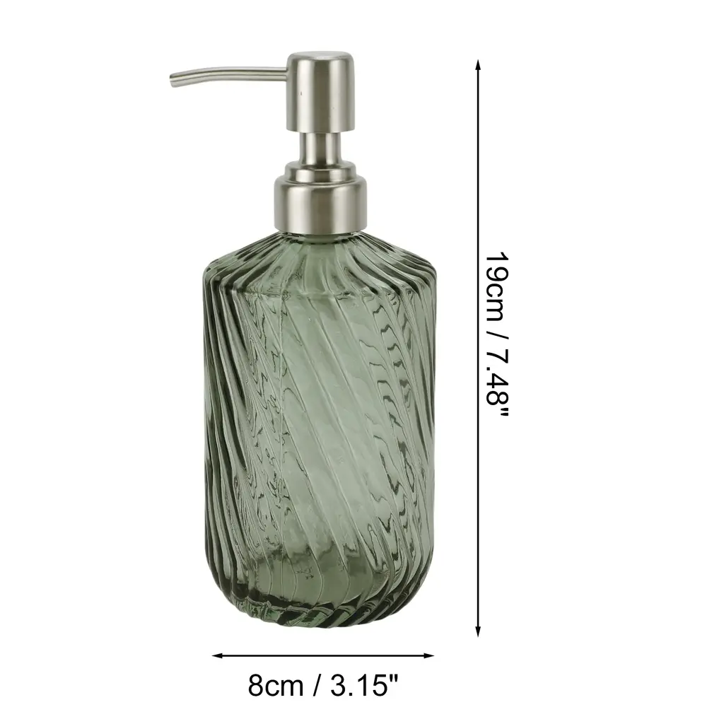 1 Pc Simple Twill Lines Soap Pump Dispenser for Bath 450ml Green Silver ToneLiquid soap dispensers are a more stylish home decor for kitchen and bathroom countertops.Stylish and modern design, simple yet elegant, adding a touch of sophistication to everyday essentials.Easy to pump, falls well on hands when pressed and does not spray on clothes.Color: Green, Silver Tone, Material: Glass, Size: 19x8cm / 7.48"x3.15"(H*D)Package Included: 1 Pc Soap Pump Dispenser.