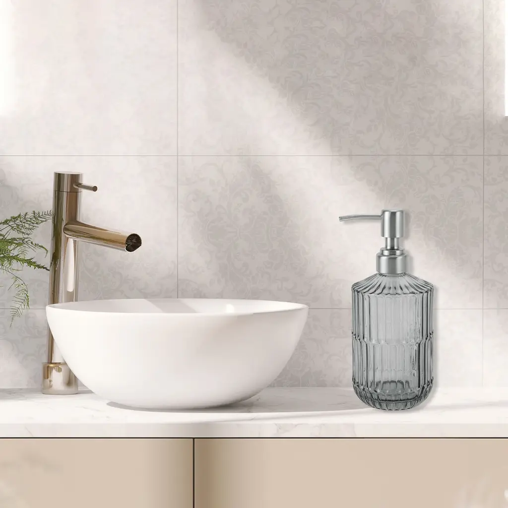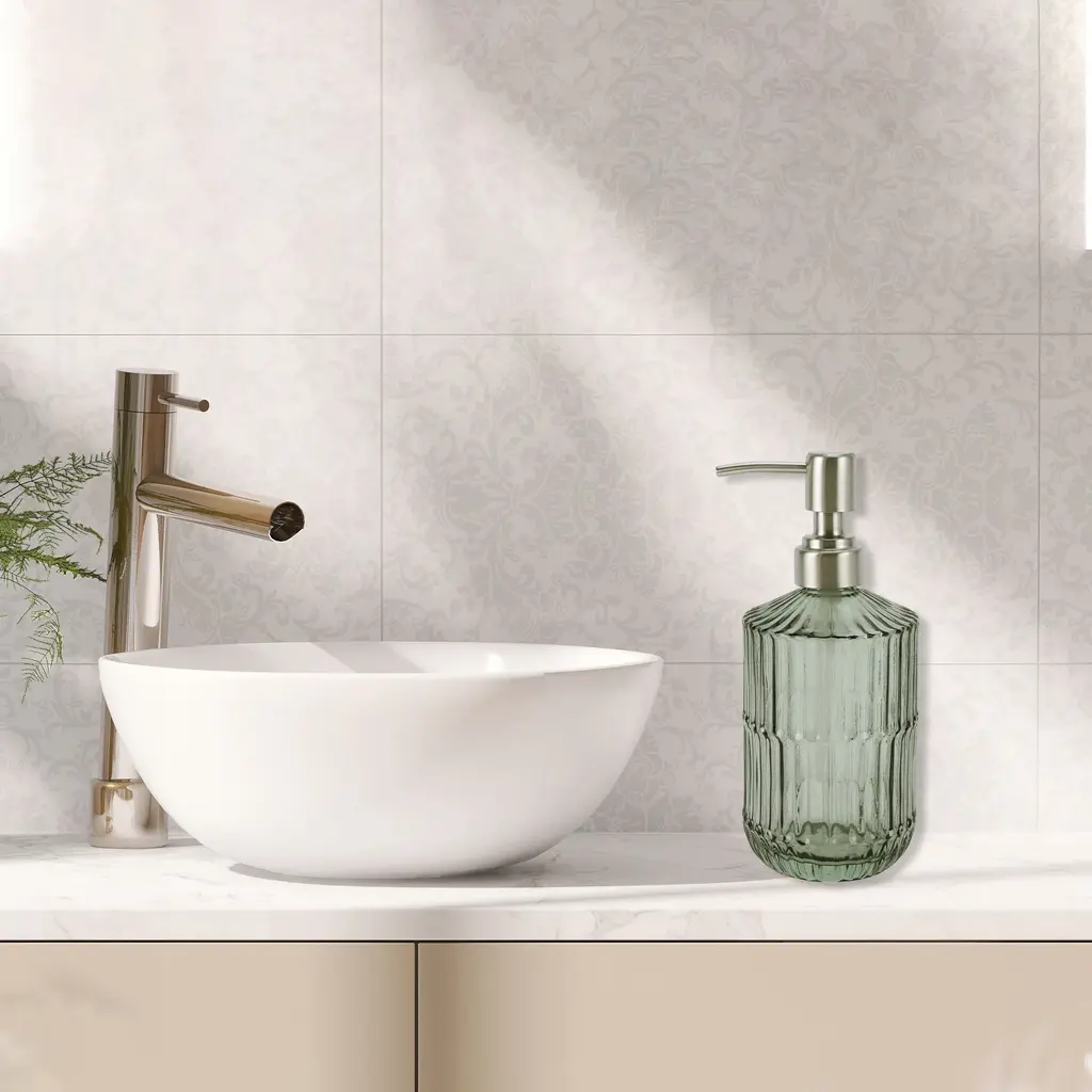 1 Pc Simple Vertical Lines Soap Pump Dispenser for Bath 450ml Green Silver ToneLiquid soap dispensers are a more stylish home decor for kitchen and bathroom countertops.Stylish and modern design, simple yet elegant, adding a touch of sophistication to everyday essentials.Easy to pump, falls well on hands when pressed and does not spray on clothes.Color: Green, Silver Tone, Material: Glass, Size: 19x8cm / 7.48"x3.15"(H*D)Package Included: 1 Pc Soap Pump Dispenser.