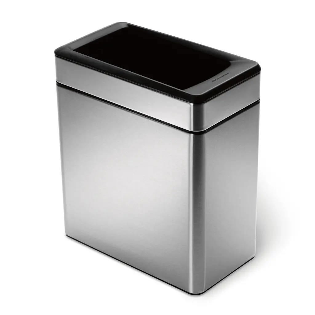 simplehuman designs innovative home essentials. Its slim shape for small spaces. Open top hides messy bag overhang. Removable bucket makes changing bags easy.