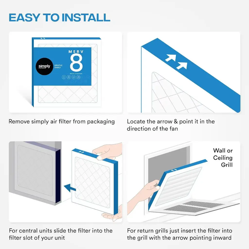 Introducing Simply Filters 14" x 17.5" x 1" MERV 8 Air Filter, your go-to solution for a healthier indoor environment. This four pack of filters, with an actual size of 14" x 17.5" x 0.75" is universally compatible, fitting seamlessly into both residential and commercial HVAC systems, working effortlessly with almost any brand. Comparable to renowned brands like 3M Filtrete MPR 600, Filterbuy AFB Silver, and Honey well l FPR 5, our filters are designed to create a cleaner environment by capturing airborne particles like dust, pet dander, lint, and pollen, ensuring fresh and clean indoor air.Experience advanced pleated technology with a higher pleat count than most retail filters, enhancing airflow and efficiency. Crafted in the USA with meticulous attention to detail, our filters are ideal for any residential setting, providing long-lasting performance for up to 3 months. Easy to install or replace, whether in air condition units, furnaces, heat pumps, or HVAC systems, simply slide the filter into the slot or follow the airflow arrows for return grills, and you're done!Your order is delivered germ and dust-free, thanks to our heat-sealed shrink wrap packaging. Consider significant savings with our subscription program for convenient auto-deliveries. Plus, experience the excellence of American craftsmanship - every filter is proudly made in the USA using 100% American components, ensuring superior filtration.Trust Simply Filters to exceed your expectations, delivering clean, fresh air for a healthier living and working space.