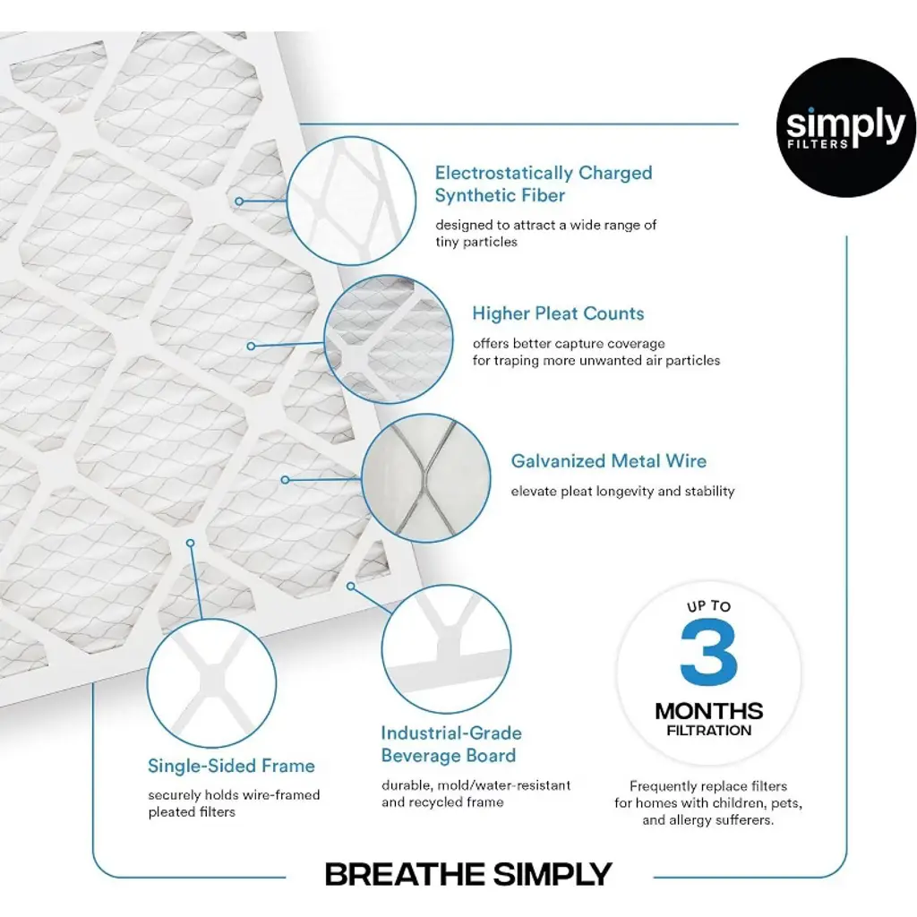 Introducing Simply Filters 14" x 27" x 1" MERV 8 Air Filter, your go-to solution for a healthier indoor environment. This six pack of filters, with an actual size of 13.75" x 26.75" x 0.75" is universally compatible, fitting seamlessly into both residential and commercial HVAC systems, working effortlessly with almost any brand. Comparable to renowned brands like 3M Filtrete MPR 600, Filterbuy AFB Silver, and Honey well l FPR 5, our filters are designed to create a cleaner environment by capturing airborne particles like dust, pet dander, lint, and pollen, ensuring fresh and clean indoor air.Experience advanced pleated technology with a higher pleat count than most retail filters, enhancing airflow and efficiency. Crafted in the USA with meticulous attention to detail, our filters are ideal for any residential setting, providing long-lasting performance for up to 3 months. Easy to install or replace, whether in air condition units, furnaces, heat pumps, or HVAC systems, simply slide the filter into the slot or follow the airflow arrows for return grills, and you're done!Your order is delivered germ and dust-free, thanks to our heat-sealed shrink wrap packaging. Consider significant savings with our subscription program for convenient auto-deliveries. Plus, experience the excellence of American craftsmanship - every filter is proudly made in the USA using 100% American components, ensuring superior filtration.Trust Simply Filters to exceed your expectations, delivering clean, fresh air for a healthier living and working space.