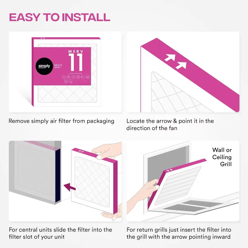 Introducing Simply Filters 20" x 20" x 1" MERV 11 Air Filter, your go-to solution for a healthier indoor environment. This twelve pack with an actual size of 19.75"x19.75"x0.75", is universally compatible, fitting seamlessly into both residential and commercial HVAC systems. It effortlessly works with almost any brand and is comparable to renowned ones like 3M Filtrete MPR 1000-1200, Filterbuy AFB Silver, and Honey well FPR 7.Our filters create a cleaner environment by capturing airborne particles like dust, mold, pet dander, pollen, and auto exhaust. Ideal for households with children and allergy sufferers, they promote a healthier living environment by ensuring clean and fresh indoor air.Experience advanced pleated technology with a higher pleat count than most retail filters, enhancing airflow and efficiency.Crafted in the USA with meticulous attention to detail, our filters are ideal for any residential setting, providing long-lasting performance for up to 3 months. Easy to install or replace, whether in air condition units, furnaces, heat pumps, or HVAC systems, simply slide the filter into the slot or follow the airflow arrows for return grills, and you're done! Your order is delivered germ and dust-free, thanks to our heat-sealed shrink wrap packaging.Consider significant savings with our subscription program for convenient auto-deliveries. Plus, experience the excellence of American craftsmanship - every filter is proudly made in USA using 100% American components, ensuring superior filtration.Trust Simply Filters to exceed your expectations, delivering clean, fresh air for a healthier living and working space.