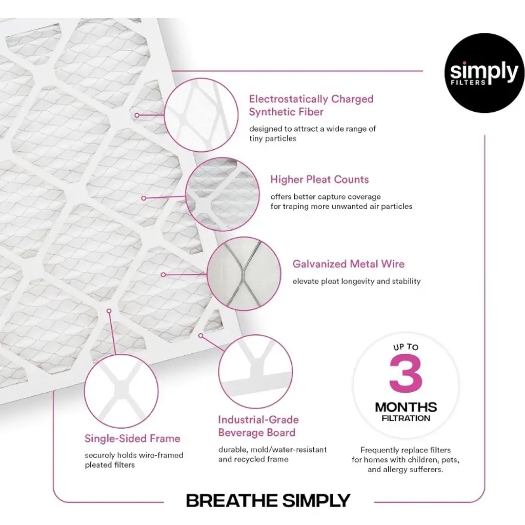 Introducing Simply Filters 20" x 20" x 1 MERV 11 Air Filter, your go-to solution for a healthier indoor environment. This twenty four pack with an actual size of 19.75"x19.75"x0.75", is universally compatible, fitting seamlessly into both residential and commercial HVAC systems. It effortlessly works with almost any brand and is comparable to renowned ones like 3M Filtrete MPR 1000-1200, Filterbuy AFB Silver, and Honey well FPR 7.Our filters create a cleaner environment by capturing airborne particles like dust, mold, pet dander, pollen, and auto exhaust. Ideal for households with children and allergy sufferers, they promote a healthier living environment by ensuring clean and fresh indoor air.Experience advanced pleated technology with a higher pleat count than most retail filters, enhancing airflow and efficiency.Crafted in the USA with meticulous attention to detail, our filters are ideal for any residential setting, providing long-lasting performance for up to 3 months. Easy to install or replace, whether in air condition units, furnaces, heat pumps, or HVAC systems, simply slide the filter into the slot or follow the airflow arrows for return grills, and you're done! Your order is delivered germ and dust-free, thanks to our heat-sealed shrink wrap packaging.Consider significant savings with our subscription program for convenient auto-deliveries. Plus, experience the excellence of American craftsmanship - every filter is proudly made in USA using 100% American components, ensuring superior filtration.Trust Simply Filters to exceed your expectations, delivering clean, fresh air for a healthier living and working space.