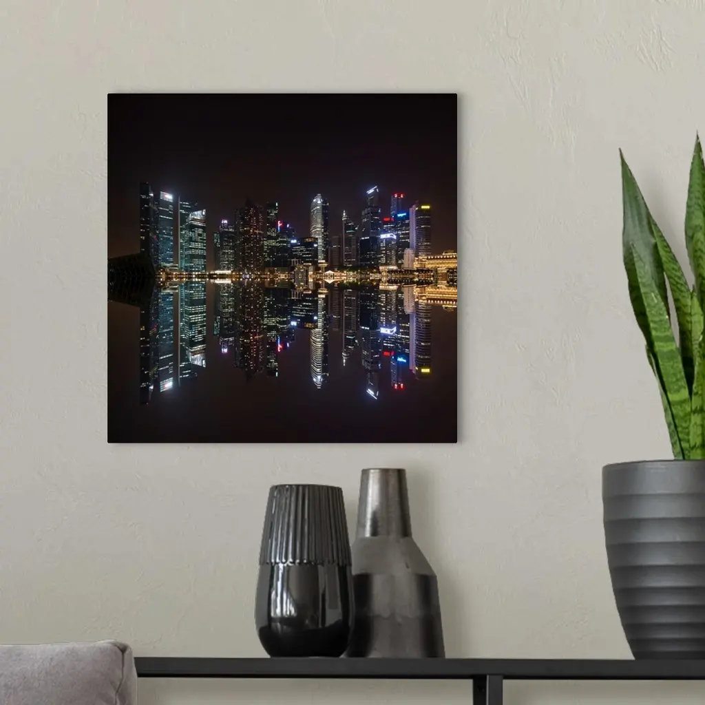 Fine art photograph of the Singapore skyline reflected in the bay at night.