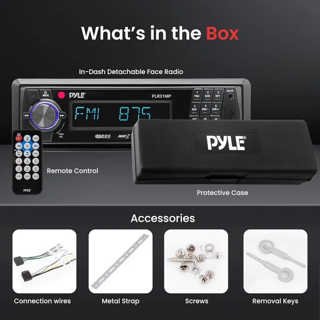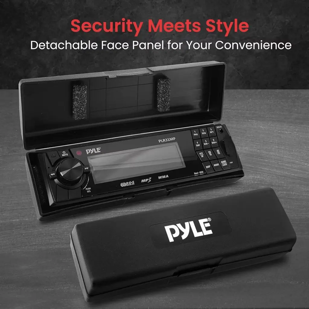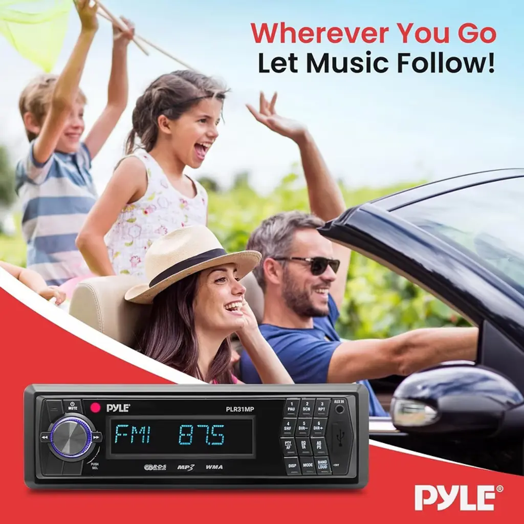 Upgrade your car's audio experience with the Pyle Single DIN Vehicle Receiver Headunit, featuring AM/FM-MPX radio and versatile media playback options. This in-dash receiver is equipped with a detachable faceplate for added security, along with USB and SD/MMC card slots that support MP3 and WMA files. With 30 preset stations, front auxiliary input, and a powerful 4 x 40 Watts output, this unit provides all the features you need for a high-quality listening experience. The red LCD display with ID3 Tag readout and red button illumination add a sleek, modern touch to your dashboard. A full-function remote control and RCA line out jack enhance the convenience and connectivity of this affordable, feature-packed receiver.