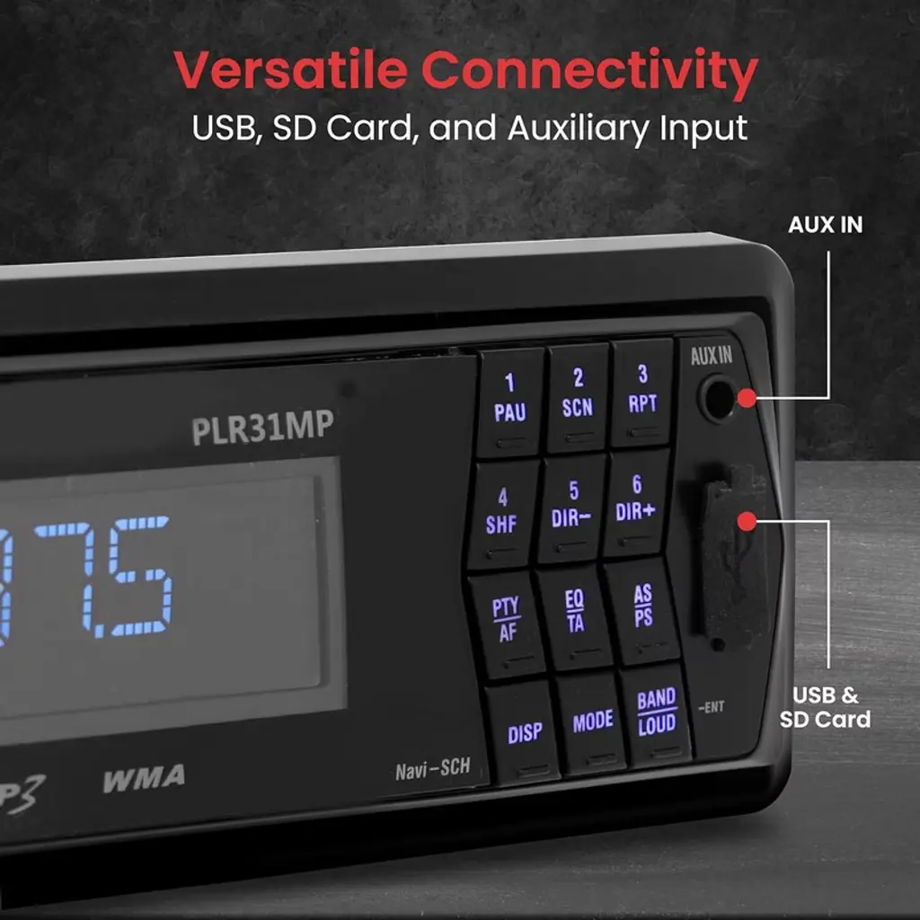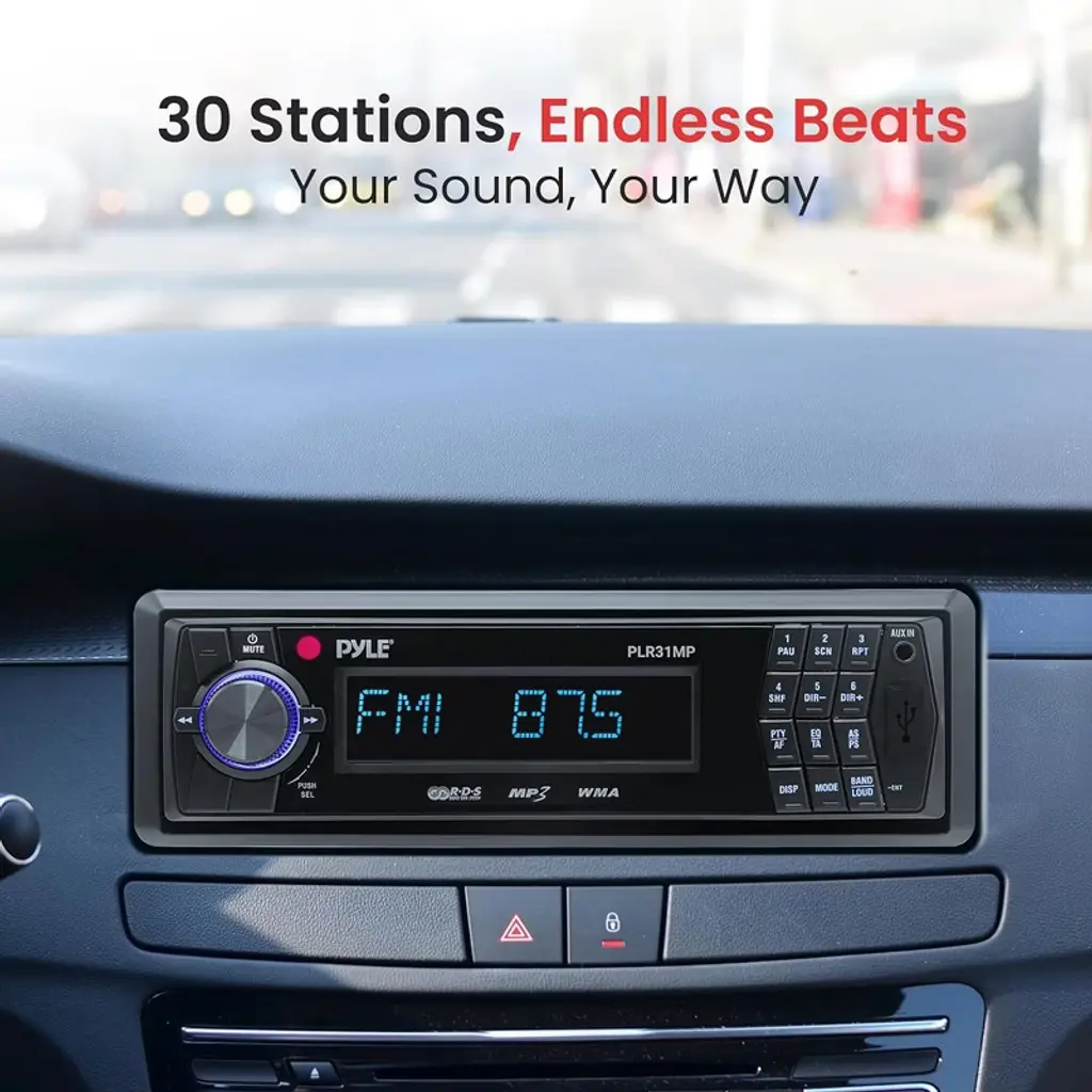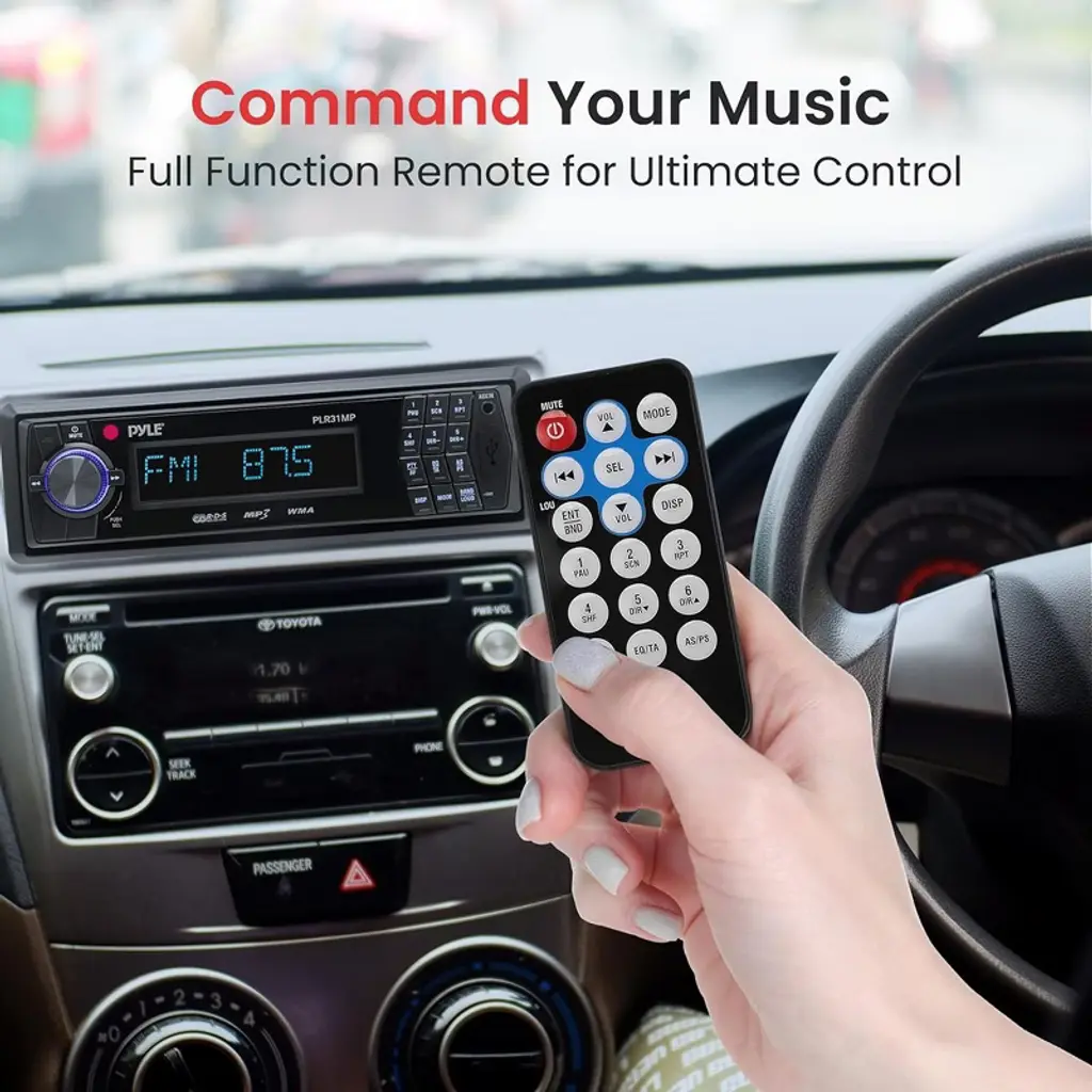 Upgrade your car's audio experience with the Pyle Single DIN Vehicle Receiver Headunit, featuring AM/FM-MPX radio and versatile media playback options. This in-dash receiver is equipped with a detachable faceplate for added security, along with USB and SD/MMC card slots that support MP3 and WMA files. With 30 preset stations, front auxiliary input, and a powerful 4 x 40 Watts output, this unit provides all the features you need for a high-quality listening experience. The red LCD display with ID3 Tag readout and red button illumination add a sleek, modern touch to your dashboard. A full-function remote control and RCA line out jack enhance the convenience and connectivity of this affordable, feature-packed receiver.