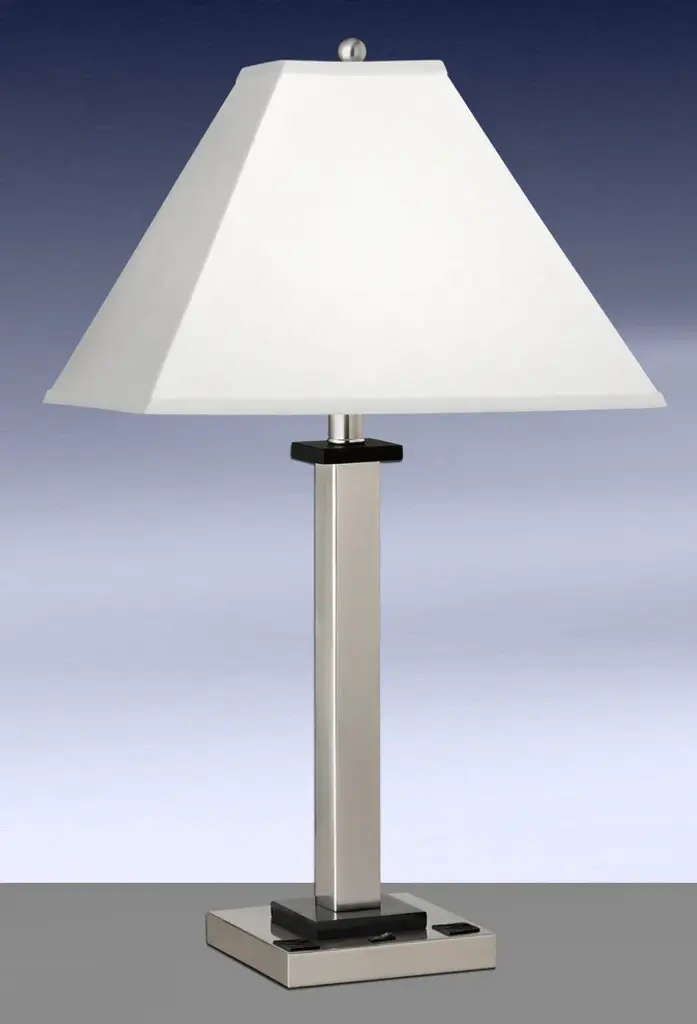 Standard Lamp Specifications for #WB2562:Product Type: Single Nightstand LampHeight: 29"Finish: Brushed SteelConstruction: Steel/WoodSocket: (1) Aluminum On/Off Med. Base Type A 150W Max socket(s). (Bulb not included)Switching: (1) On/Off Rocker switch(es) located on the base.Cord: 8'' (from base) long black 16 gauge cord set with a 3 prong grounded plug.Electrical Outlet: (2) 3 prong grounded outlet(s).Data Port: None.USB Port: None.UL/CUL and/or ETL listed: YesHarp Size: 9.5 inches (including the saddle)Standard Packing: 2 per carton (shade packed separately).Lamps & Shades per SKU: 1Lamping: (1) Aluminum On/Off Med. Base Type A 150W Max socket(s).Shade Size and Description: White fabric laminated to square styrene hardback with self fold trim measuring 4.5"/4.5" x 14"/14" x 11" w/ .5" drop (Top x Bottom x Slant).Bulb Included: NoMaterial Description: constructed from polished, plated, and lacquered steel.