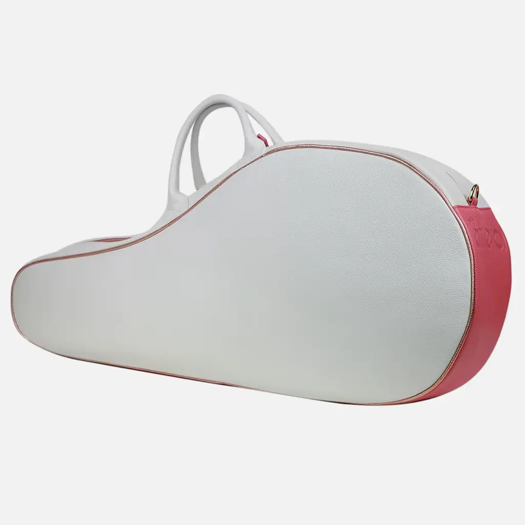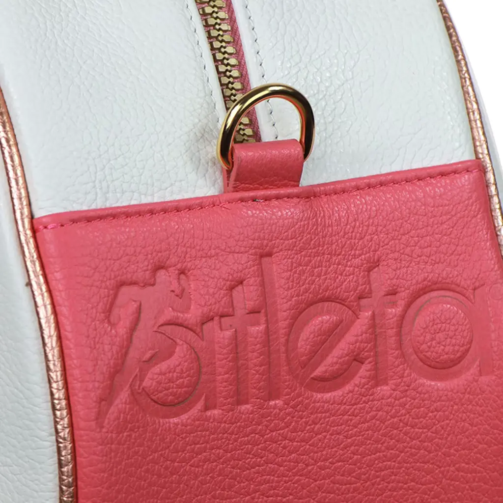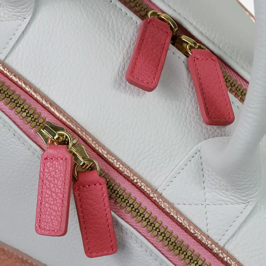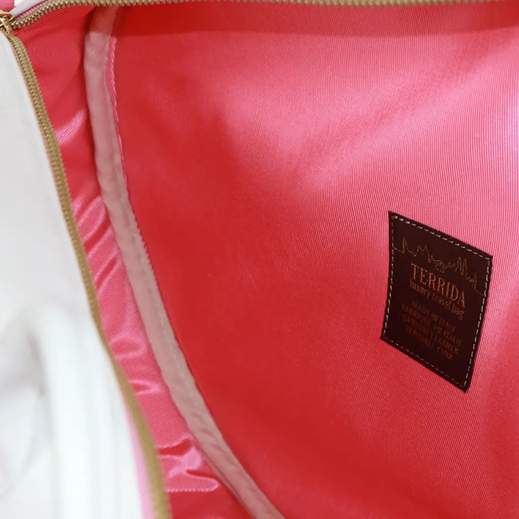 Brimming with elegant vintage flair, this sports bag is deftly handcrafted of first-rate waterproof leather colored in white, pink, and bronze. It features a large inner pocket and a separate compartment for shoes, and can also be completed with adjustable shoulder straps upon choice. Customizable, it can be monogrammed, please ask the Concierge for more details.