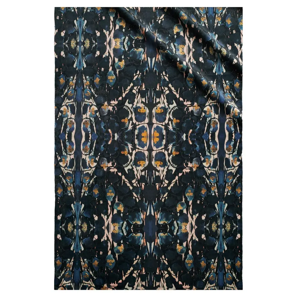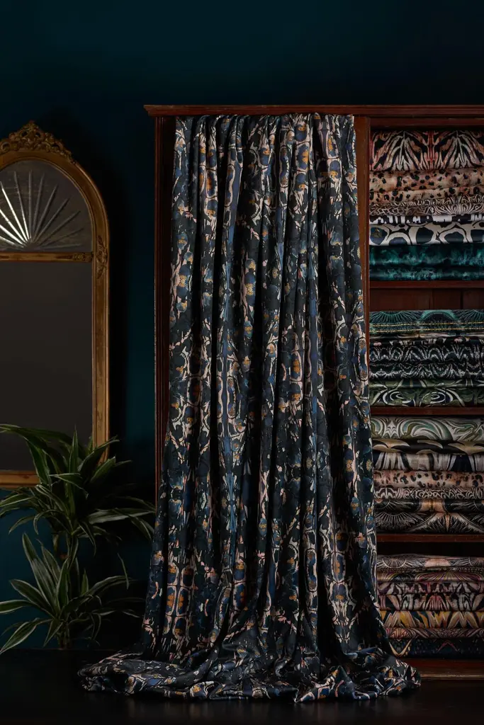 Our dark and edgy Siouxsie print available as fabric for your project. Pronounced ‘Suzy’, this print is inspired by Siouxsie Sioux.This velvet has a very different handle from our standard velvet. It is extremely floppy and very soft, which makes it ideal for curtains that need to drape. Great for pooling on the floor, the velvet folds easily, creating a dense, textured look.140cm widePattern repeat 30cm wide and 43cm high100% polyester100’000 rub countDry clean onlyWeight 345 grams per square metre Please note our velvets are not naturally fire retardant. FR and CRIB 5 treatment available upon request. The cost for FR and CRIB 5 treatment is an additional £6/metre.Delivery time – This fabric is printed to order and dispatched directly from our print partner, within approximately 2 weeks.Samples are available on request for a cost of £2.00. Samples are approximately A5 size and are available for immediate dispatch.
