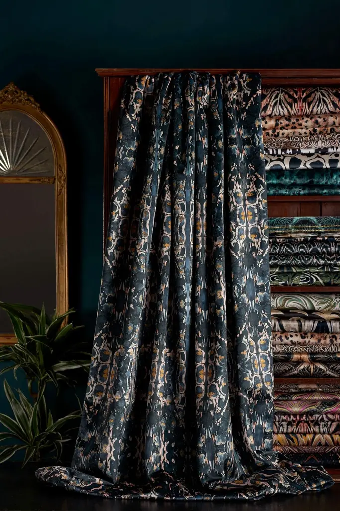 Our dark and edgy Siouxsie print available as fabric for your project. Pronounced ‘Suzy’, this print is inspired by Siouxsie Sioux.This velvet is midweight, with a strong straight woven backing, so is suitable for upholstery, but is also light enough for curtains and cushions.Measures: 140 cm wide.Pattern repeat 30 cm wide and 43 cm high.100% polyester.50’000 rub count.Dry clean only.Weight 345 grams per square metre. Please note our velvets are not naturally fire retardant. FR and CRIB 5 treatment available upon request. The cost for FR and CRIB 5 treatment is an additional £6/metre.Delivery time – This fabric is printed to order and dispatched directly from our print partner, within approximately 2 weeks. If you have a particular deadline do let us know. Fabric is shipped on rolls. Samples are available on request for a cost of £2.00. Samples are approximately A5 size and are available for immediate dispatch.