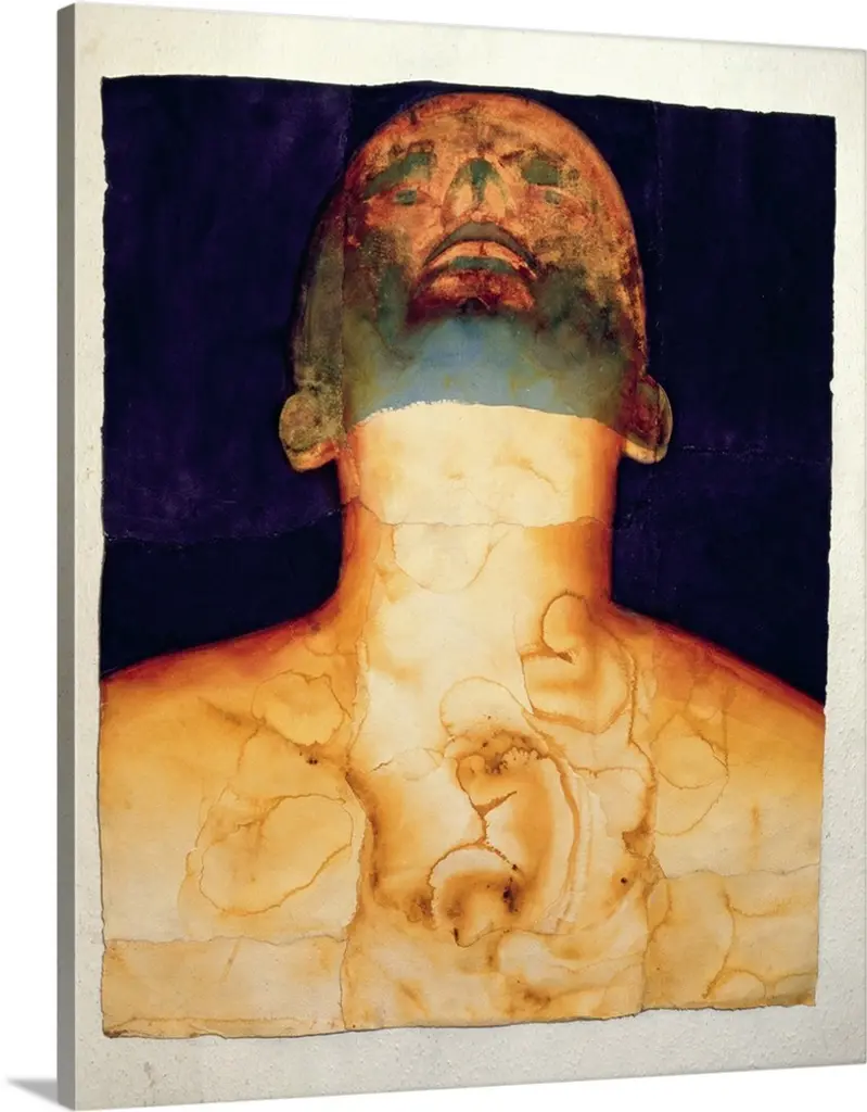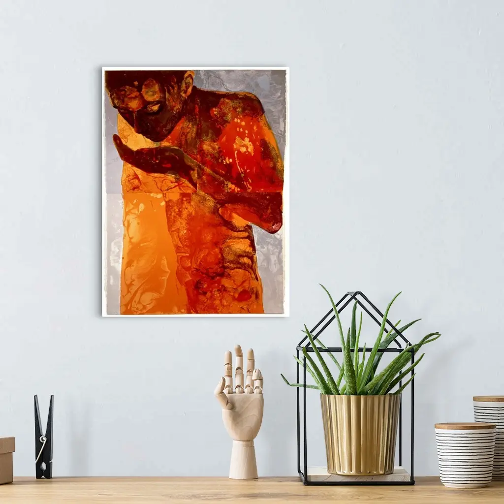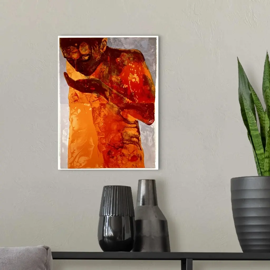 A giclee print on canvas originally from a silkscreen print. An abstracted human figure sips from their hand; the figure is shaded with a blend of dark and light oranges giving them a corroded metal appearance.